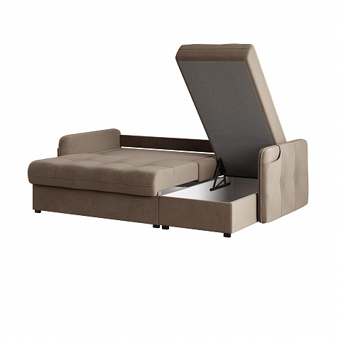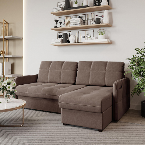 Угловой диван «Киль» с карманом на подлокотнике и двумя ящиками для белья сэкономит пространство в доме. Модель с широким посадочным местом не займёт много места благодаря узким подлокотникам. В двух ящиках можно спрятать много вещей и освободить место в комнате для новых покупок. Диван не перегружен декором, поэтому подойдёт к большинству современных интерьеров.