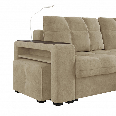 Пуф в комплекте. В корпус более широкого подлокотника встроен пуф. Его можно использовать как дополнительное посадочное место или в качестве подставки под ноги.