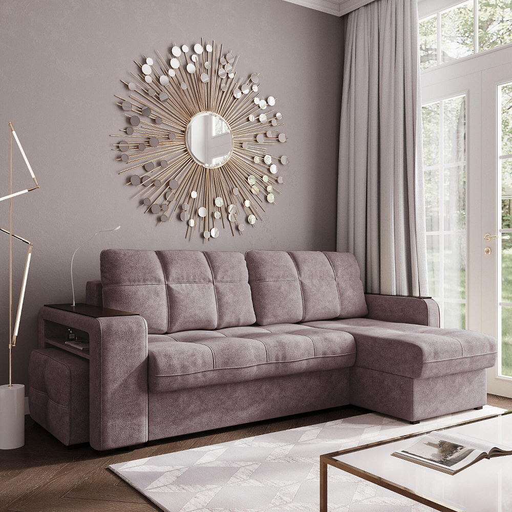 Угловой диван «Киль» подойдёт тем, кто ищет многофункциональную модель для отдыха и работы. Модель со спальным местом отличается технологичными подлокотниками, портативной лампой в комплекте, двумя ящиками для белья и встроенным пуфиком. Вдобавок к большому функционалу диван не перегружен декором, поэтому прекрасно подойдёт к большинству современных интерьеров.