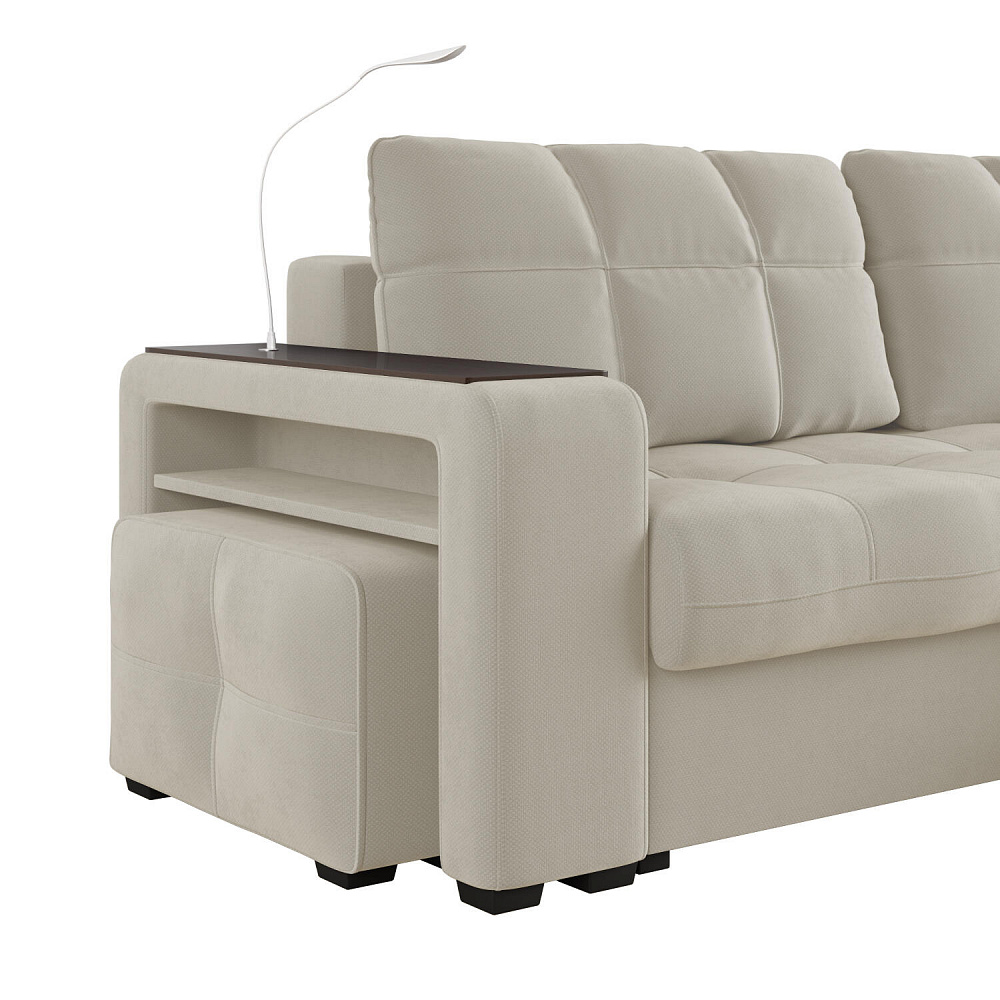 Пуф в комплекте. В корпус более широкого подлокотника встроен пуф. Его можно использовать как дополнительное посадочное место или в качестве подставки под ноги.