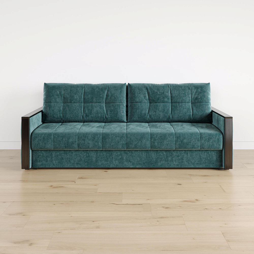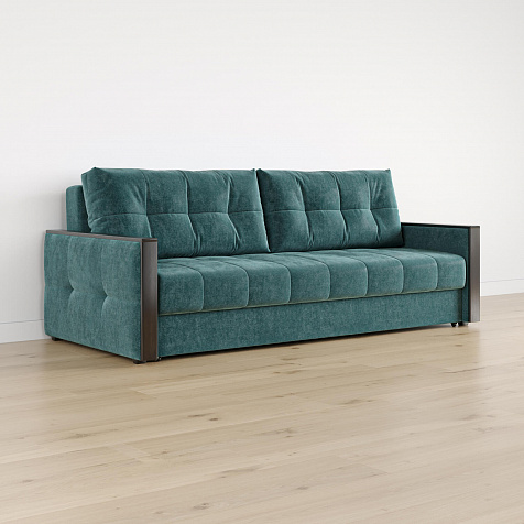 Механизм трансформации «Еврокнижка». Диван легко раскладывается — нужно выкатить вперёд сиденье и опустить спинку. Удобен механизм ещё тем, что двигается только передняя часть, поэтому отодвигать диван от стены не требуется.
