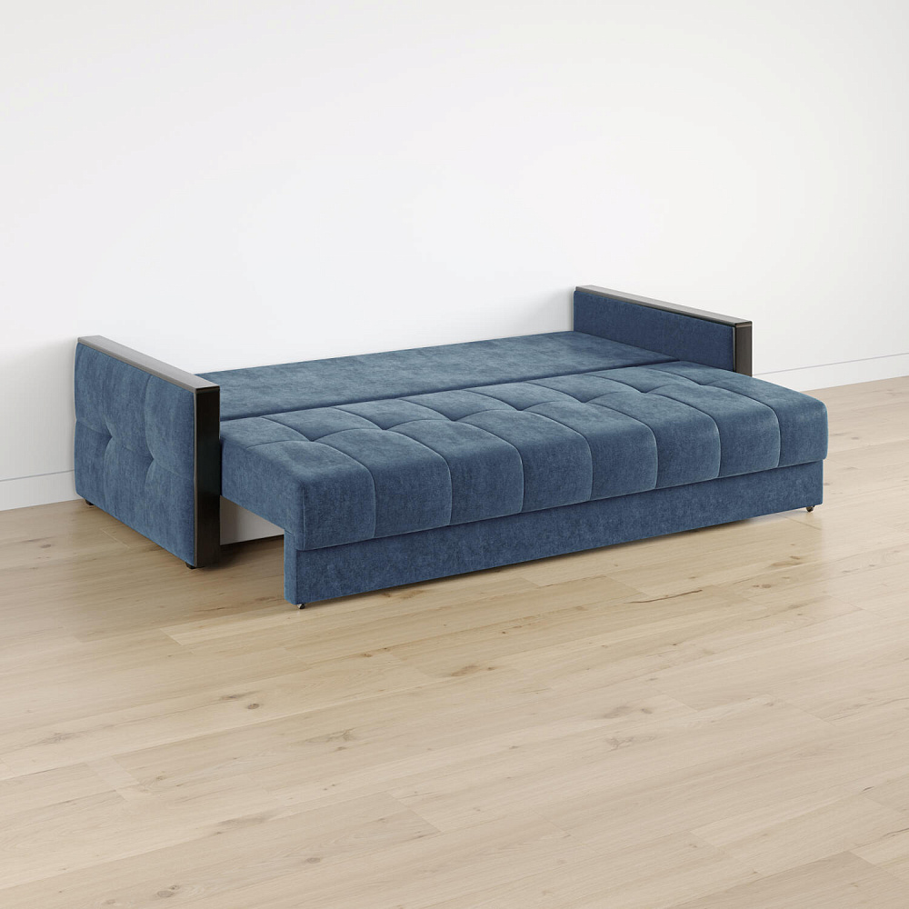 Механизм трансформации «Еврокнижка». Диван легко раскладывается — нужно выкатить вперёд сиденье и опустить спинку. Удобен механизм ещё тем, что двигается только передняя часть, поэтому отодвигать диван от стены не требуется.