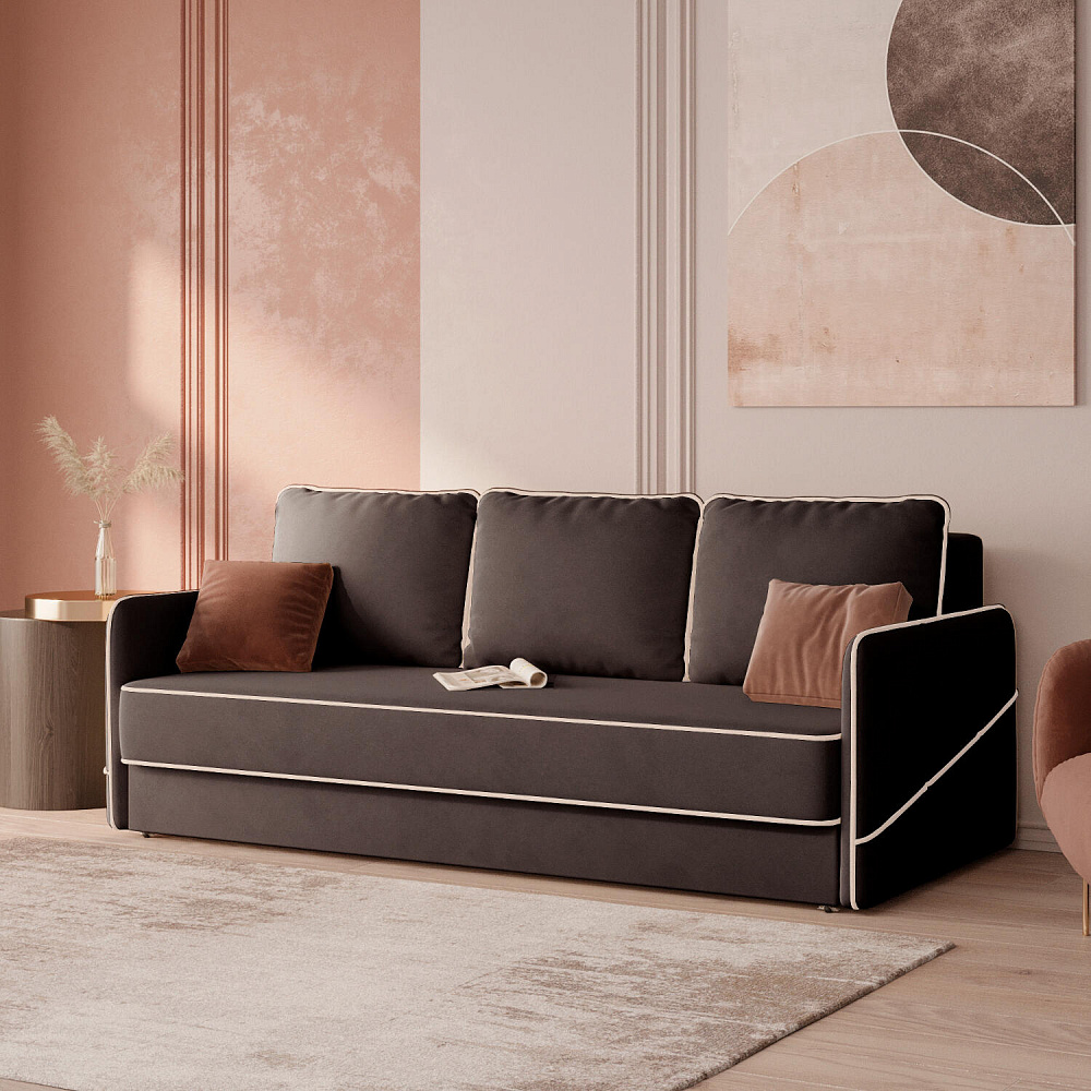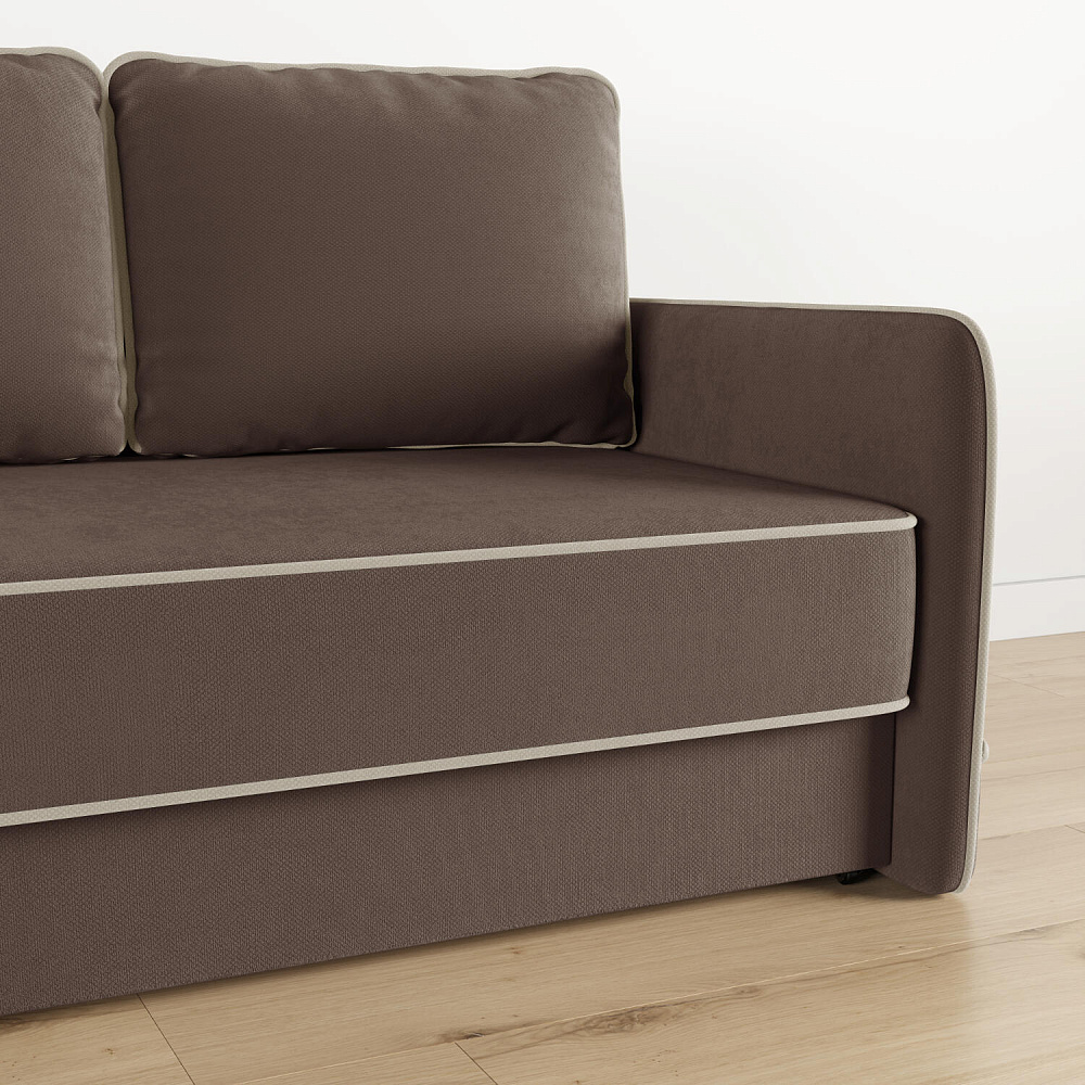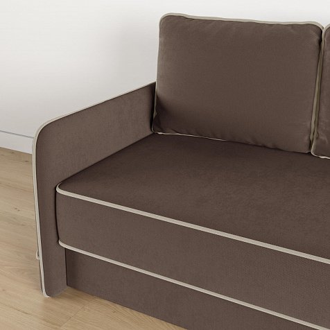 Диван «Симпл» станет стильным акцентом в современной гостиной. Контрастный кант на обивке из мягкого велюра придаёт дизайну дивана завершённый вид и подчёркивает мягкую геометричность. Механизм трансформации «Еврокнижка» в сложенном виде позволяет сэкономить пространство в комнате, в разложенном — обеспечивает комфортное и ровное спальное место. Спинка дивана выполнена в той же обивке, что и основная часть, что даёт возможность использовать диван для зонирования комнаты.