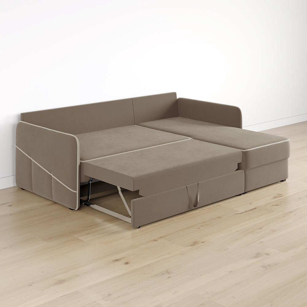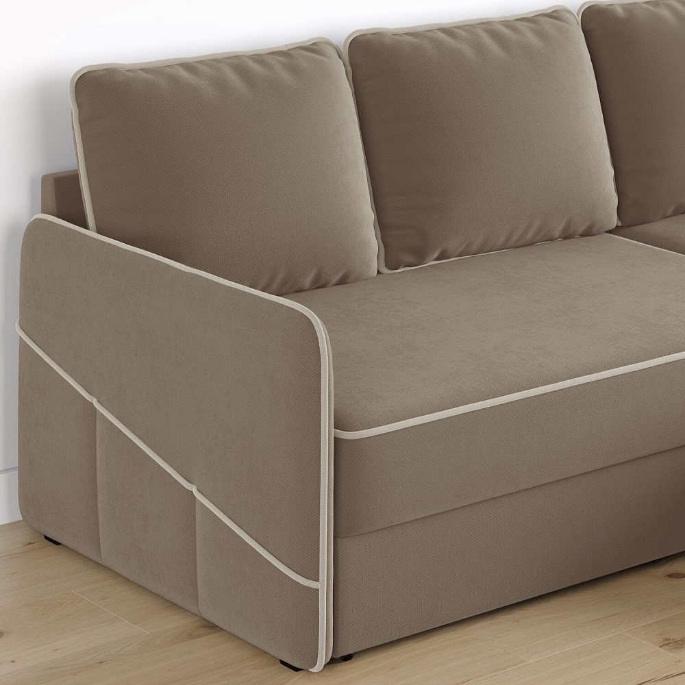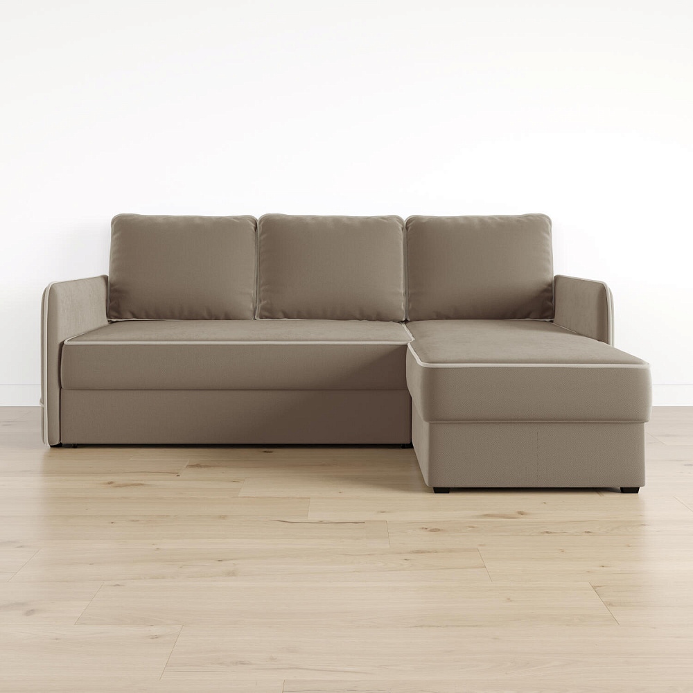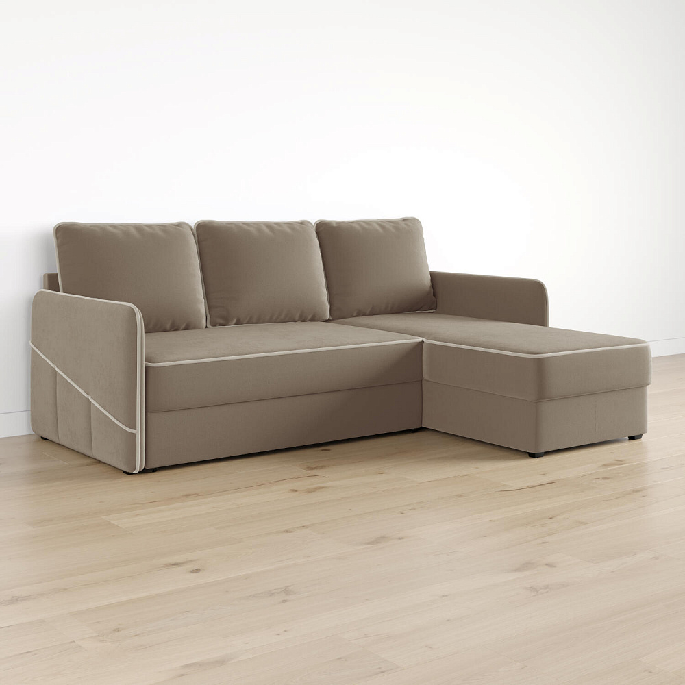 Диван угловой «Симпл» станет стильным акцентом в современной гостиной. Контрастный кант на обивке из мягкого велюра придаёт дизайну дивана завершённый вид и подчёркивает мягкую геометричность. Механизм трансформации «Дельфин» в сложенном виде позволяет сэкономить пространство в комнате, в разложенном — обеспечивает комфортное и ровное спальное место. Спинка дивана выполнена в той же обивке, что и основная часть, что даёт возможность использовать диван для зонирования комнаты.