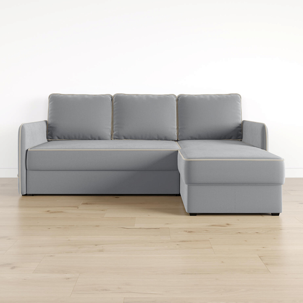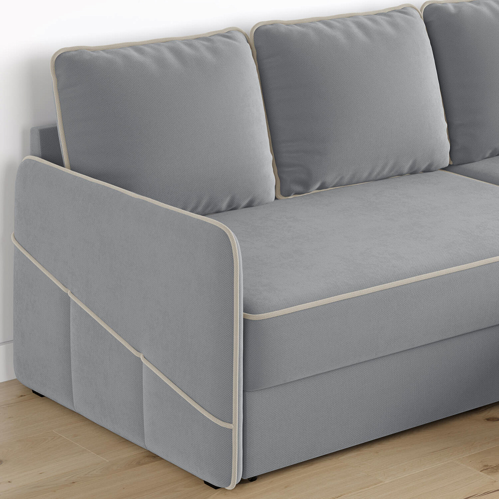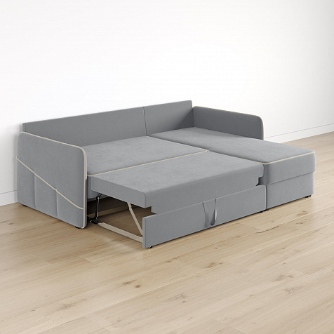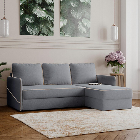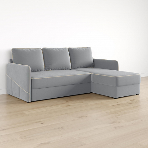 Диван угловой «Симпл» станет стильным акцентом в современной гостиной. Контрастный кант на обивке из мягкого велюра придаёт дизайну дивана завершённый вид и подчёркивает мягкую геометричность. Механизм трансформации «Дельфин» в сложенном виде позволяет сэкономить пространство в комнате, в разложенном — обеспечивает комфортное и ровное спальное место. Спинка дивана выполнена в той же обивке, что и основная часть, что даёт возможность использовать диван для зонирования комнаты.