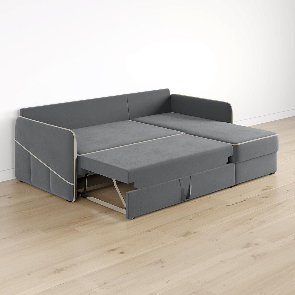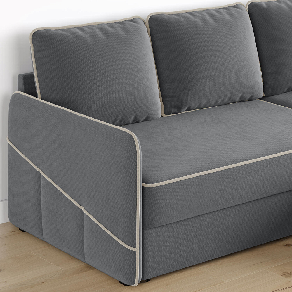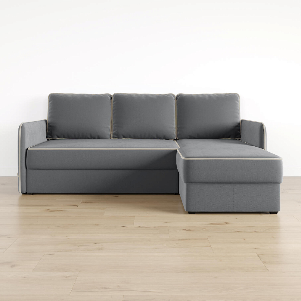 Диван угловой «Симпл» станет стильным акцентом в современной гостиной. Контрастный кант на обивке из мягкого велюра придаёт дизайну дивана завершённый вид и подчёркивает мягкую геометричность. Механизм трансформации «Дельфин» в сложенном виде позволяет сэкономить пространство в комнате, в разложенном — обеспечивает комфортное и ровное спальное место. Спинка дивана выполнена в той же обивке, что и основная часть, что даёт возможность использовать диван для зонирования комнаты.