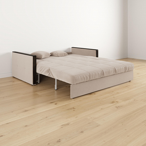 Механизм трансформации «Аккордеон». Чтобы разложить диван, необходимо приподнять сиденье и слегка потянуть на себя, далее диван разложится сам. Поверхность спального места ровная, без петель и швов, поэтому сон будет приятным и комфортным. Прорезиненные ролики защитят напольное покрытие от истирания.