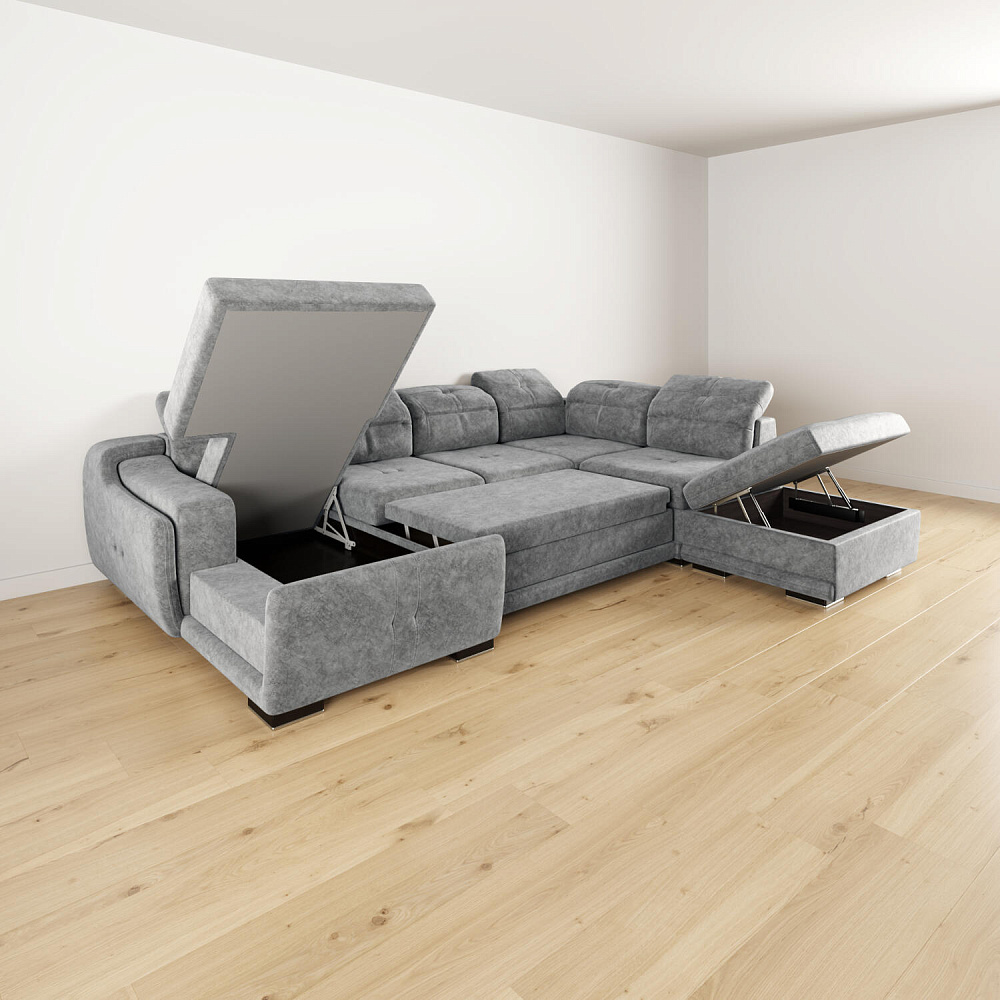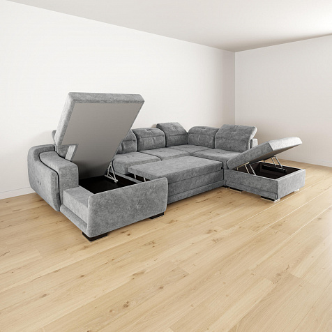 - Два короба для белья в оттоманке и пуфе оснащены подъёмными механизмами газлифт, которые закрыты специальным чехлом, защищая тем самым постельное бельё.