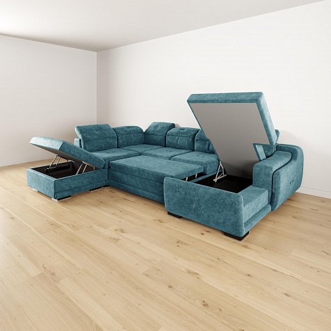 - Два короба для белья в оттоманке и пуфе оснащены подъёмными механизмами газлифт, которые закрыты специальным чехлом, защищая тем самым постельное бельё.