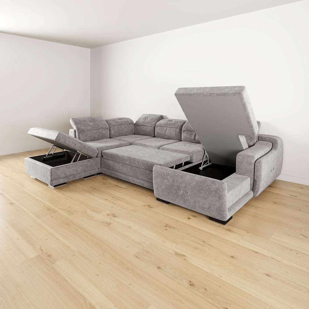- Два короба для белья в оттоманке и пуфе оснащены подъёмными механизмами газлифт, которые закрыты специальным чехлом, защищая тем самым постельное бельё.