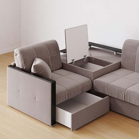 Вместительная система хранения. Под баром расположен вместительный короб, а в угловом модуле — глубокий ящик. В них удобно хранить одеяла, подушки, пледы и постельное белье.