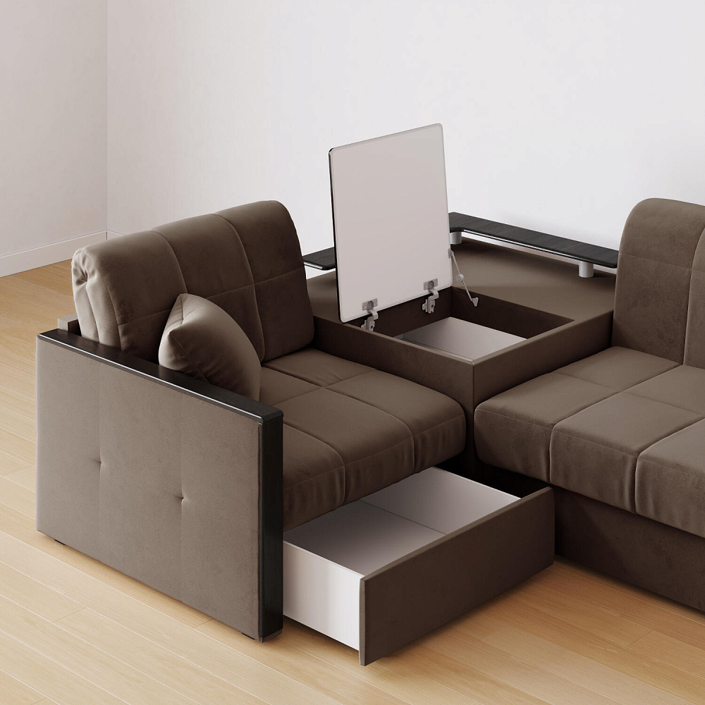 Вместительная система хранения. Под баром расположен вместительный короб, а в угловом модуле — глубокий ящик. В них удобно хранить одеяла, подушки, пледы и постельное белье.