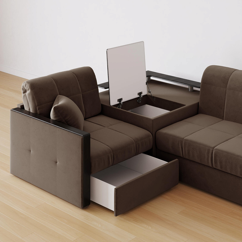 Вместительная система хранения. Под баром расположен вместительный короб, а в угловом модуле — глубокий ящик. В них удобно хранить одеяла, подушки, пледы и постельное белье.