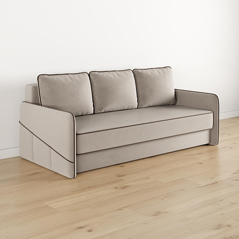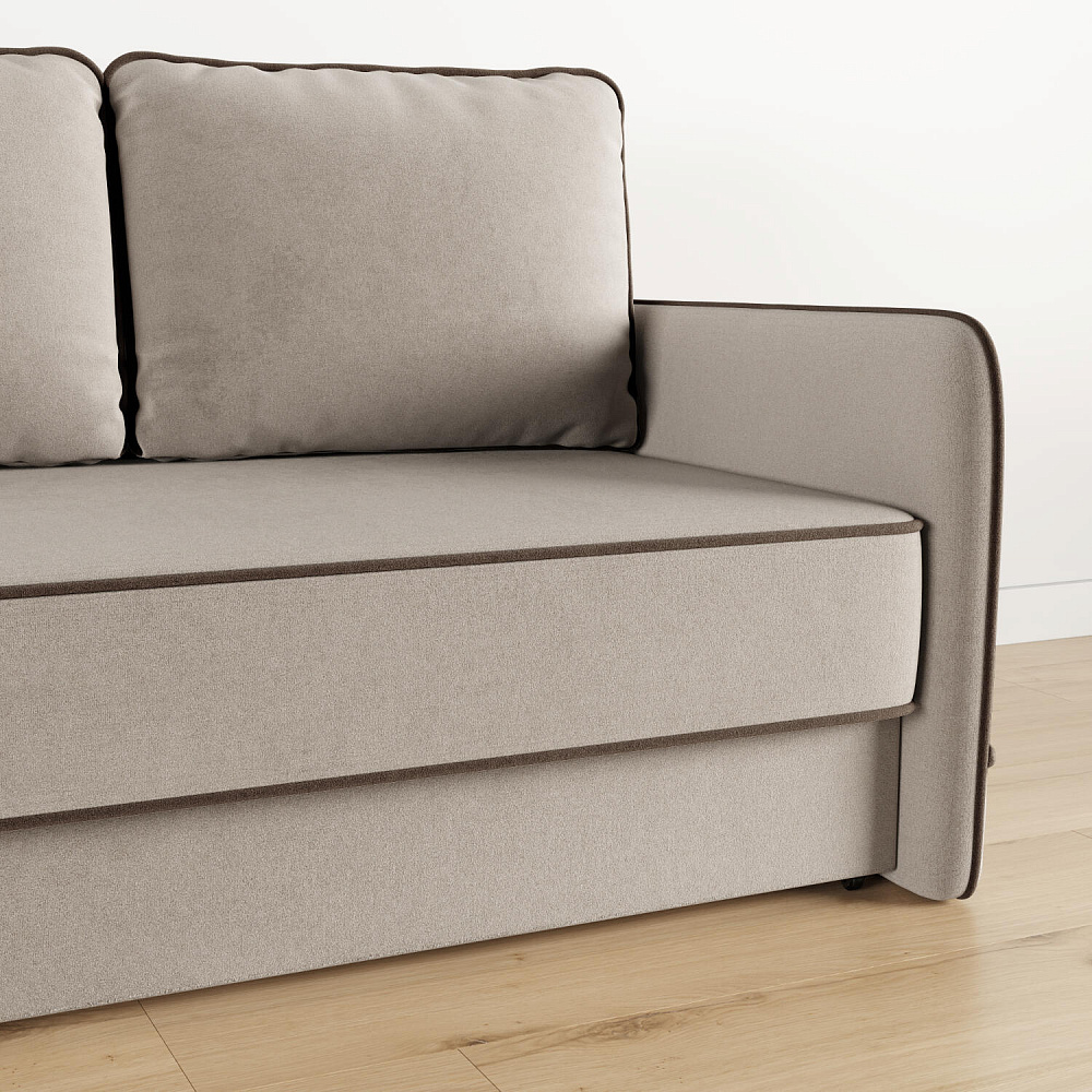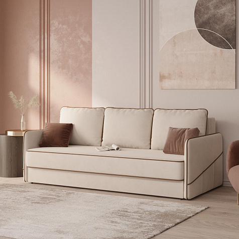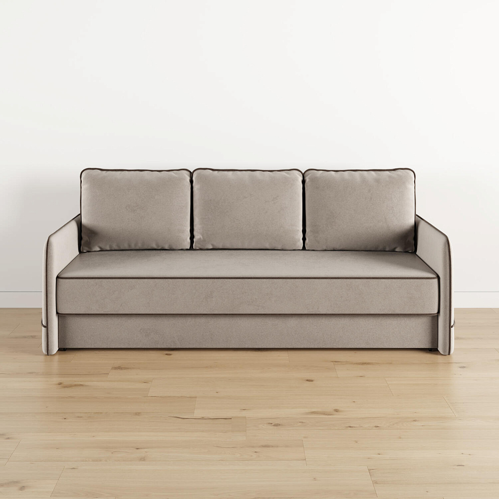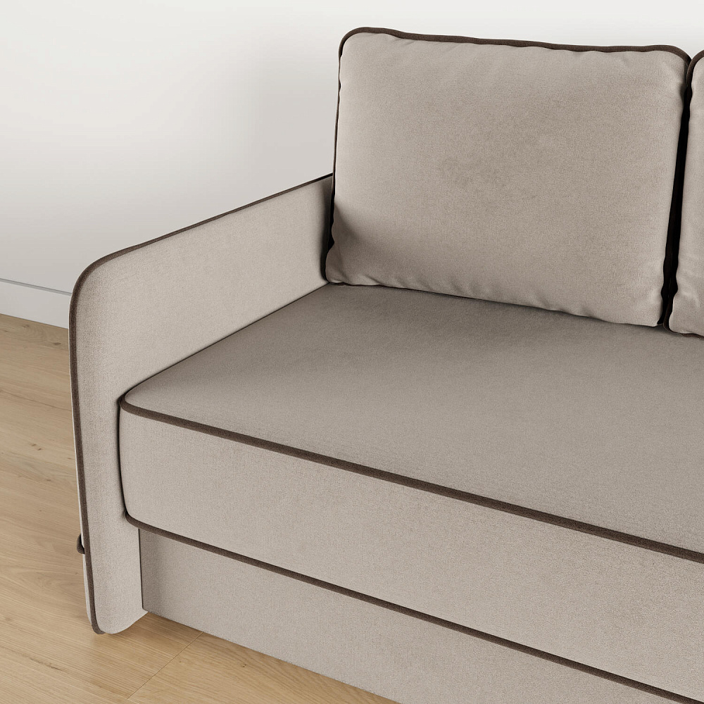 Диван «Симпл» станет стильным акцентом в современной гостиной. Контрастный кант на обивке из мягкого велюра придаёт дизайну дивана завершённый вид и подчёркивает мягкую геометричность. Механизм трансформации «Еврокнижка» в сложенном виде позволяет сэкономить пространство в комнате, в разложенном — обеспечивает комфортное и ровное спальное место. Спинка дивана выполнена в той же обивке, что и основная часть, что даёт возможность использовать диван для зонирования комнаты.
