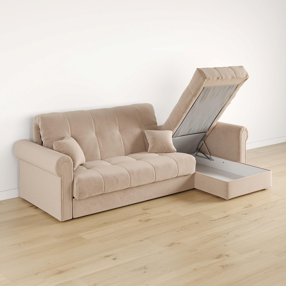 - Короб для белья. В оттоманке дивана скрыт просторный бельевой ящик, в котором можно разместить все необходимые постельные принадлежности.