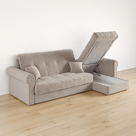 - Короб для белья. В оттоманке дивана скрыт просторный бельевой ящик, в котором можно разместить все необходимые постельные принадлежности.
