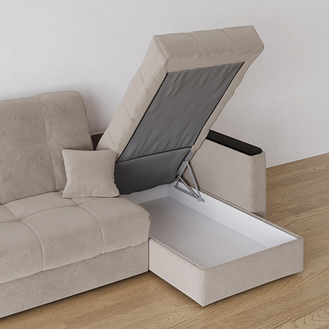 - Короб для белья. В оттоманке дивана скрыт просторный бельевой ящик, в котором можно разместить все необходимые постельные принадлежности.