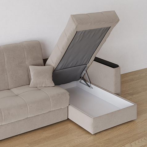 - Короб для белья. В оттоманке дивана скрыт просторный бельевой ящик, в котором можно разместить все необходимые постельные принадлежности.