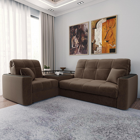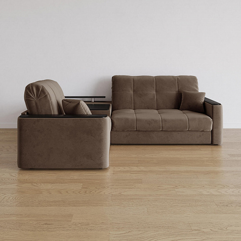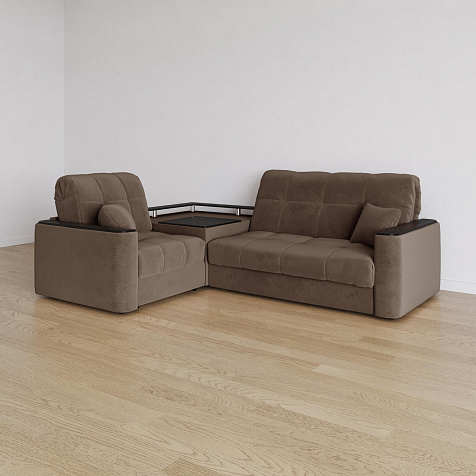 Диван угловой «Камелот» с баром станет главным местом для отдыха и приема гостей. Модель оснащена баром, на котором можно расположить еду и напитки во время просмотра фильмов и сериалов. Пропорциональные формы, плавные линии на сиденье и спинке подчеркивают лаконичный дизайн, поэтому диван подойдёт для любого современного интерьера. Диван создаст в комнате комфортную обстановку и придаст ей неповторимый вид.