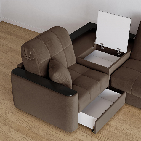- Вместительная система хранения. Под баром расположен вместительный короб, а в угловом модуле — глубокий ящик. В них удобно хранить одеяла, подушки, пледы и постельное белье.