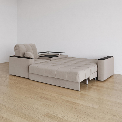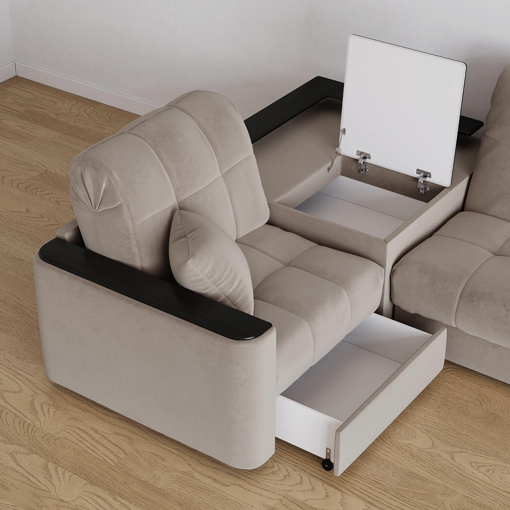 - Вместительная система хранения. Под баром расположен вместительный короб, а в угловом модуле — глубокий ящик. В них удобно хранить одеяла, подушки, пледы и постельное белье.