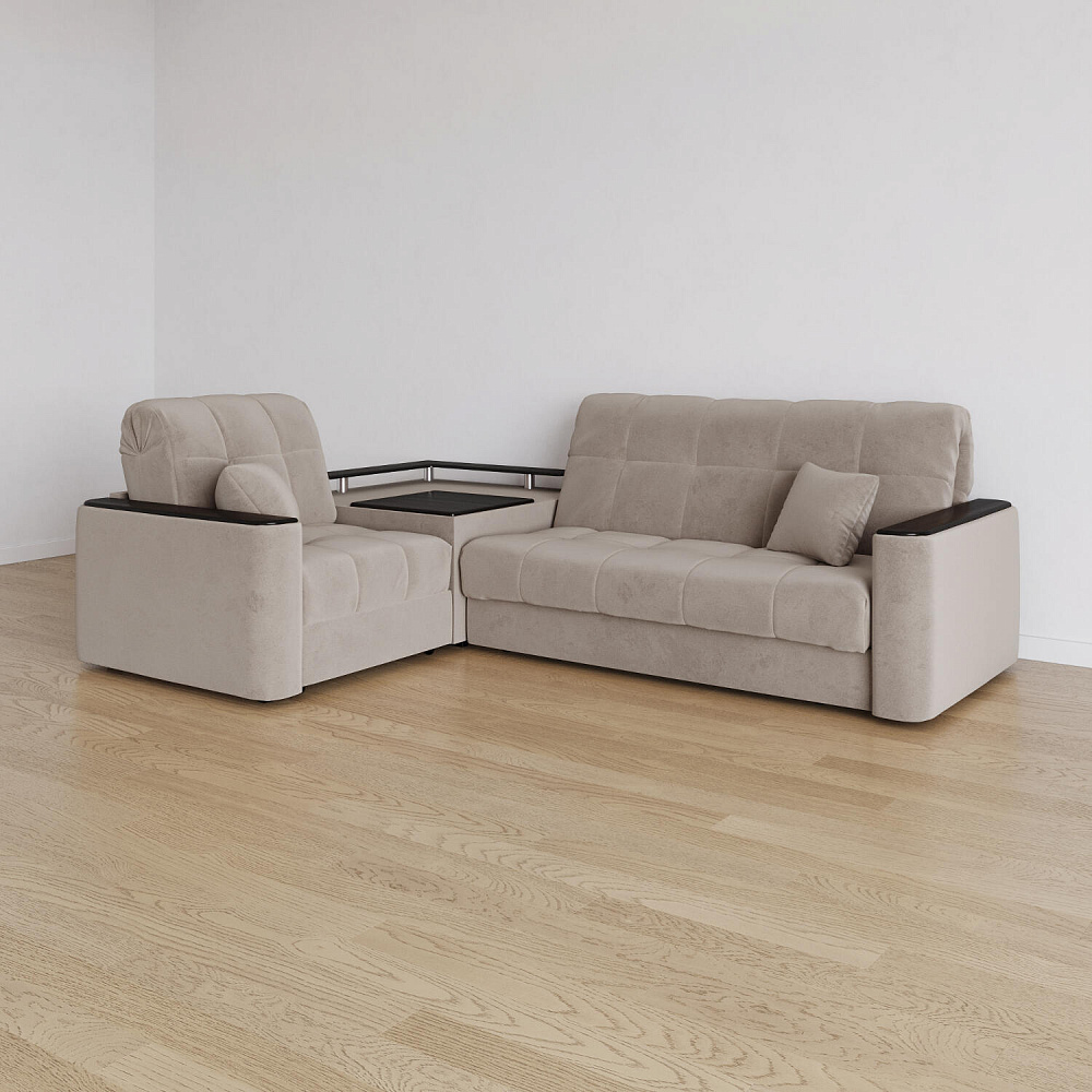 Диван угловой «Камелот» с баром станет главным местом для отдыха и приема гостей. Модель оснащена баром, на котором можно расположить еду и напитки во время просмотра фильмов и сериалов. Пропорциональные формы, плавные линии на сиденье и спинке подчеркивают лаконичный дизайн, поэтому диван подойдёт для любого современного интерьера. Диван создаст в комнате комфортную обстановку и придаст ей неповторимый вид.