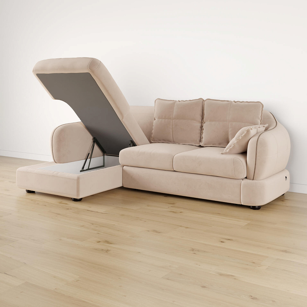 - Ящик для белья. В конструкции дивана предусмотрено вместительное отделение под подъемной угловой частью для хранения постельных принадлежностей.