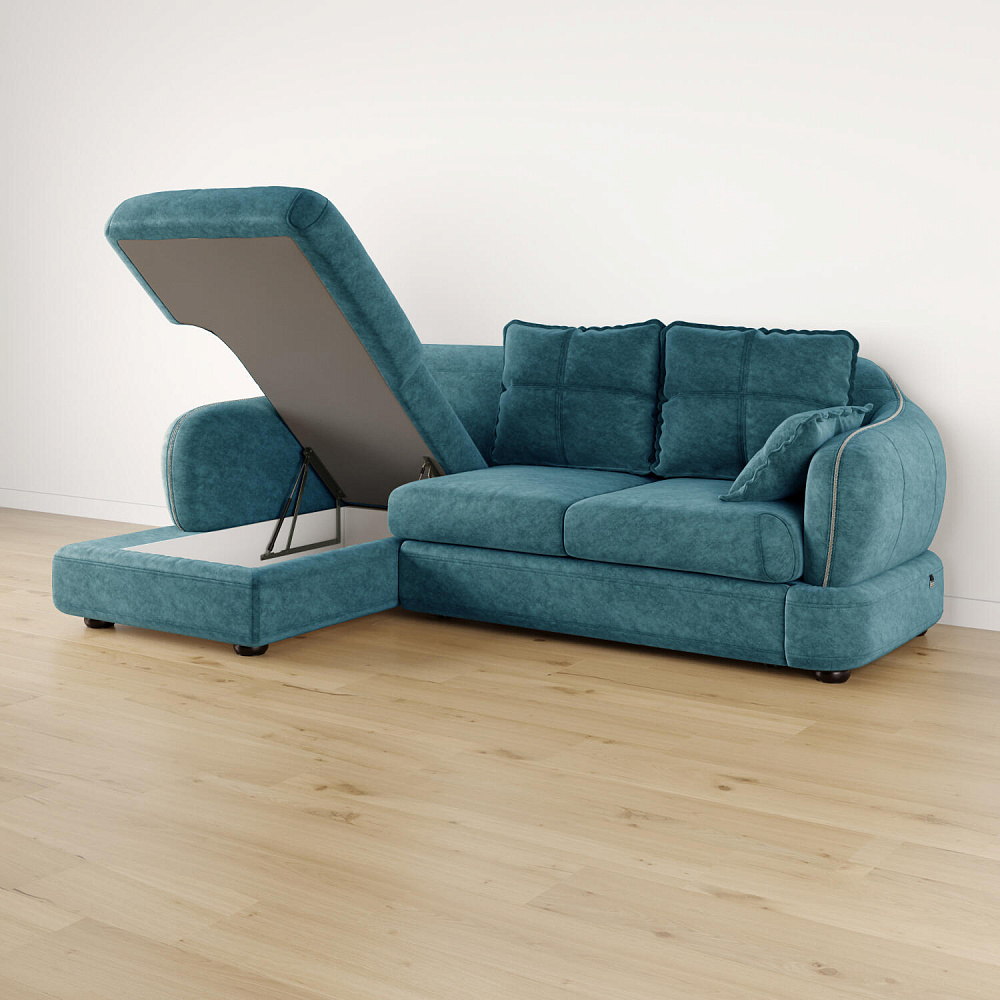 - Ящик для белья. В конструкции дивана предусмотрено вместительное отделение под подъемной угловой частью для хранения постельных принадлежностей.