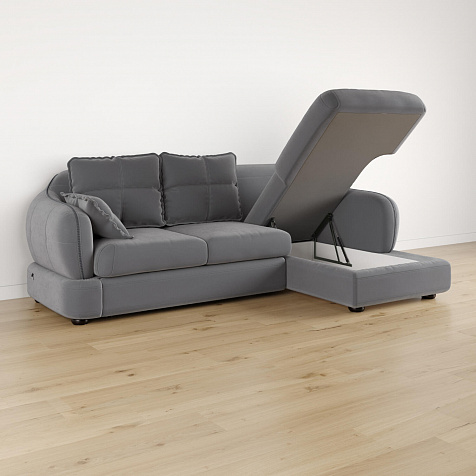 - Ящик для белья. В конструкции дивана предусмотрено вместительное отделение под подъемной угловой частью для хранения постельных принадлежностей.