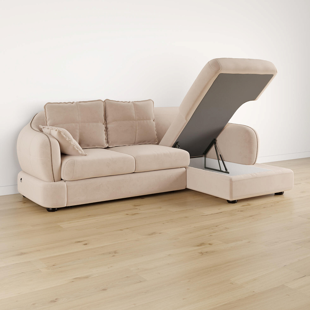- Ящик для белья. В конструкции дивана предусмотрено вместительное отделение под подъемной угловой частью для хранения постельных принадлежностей.