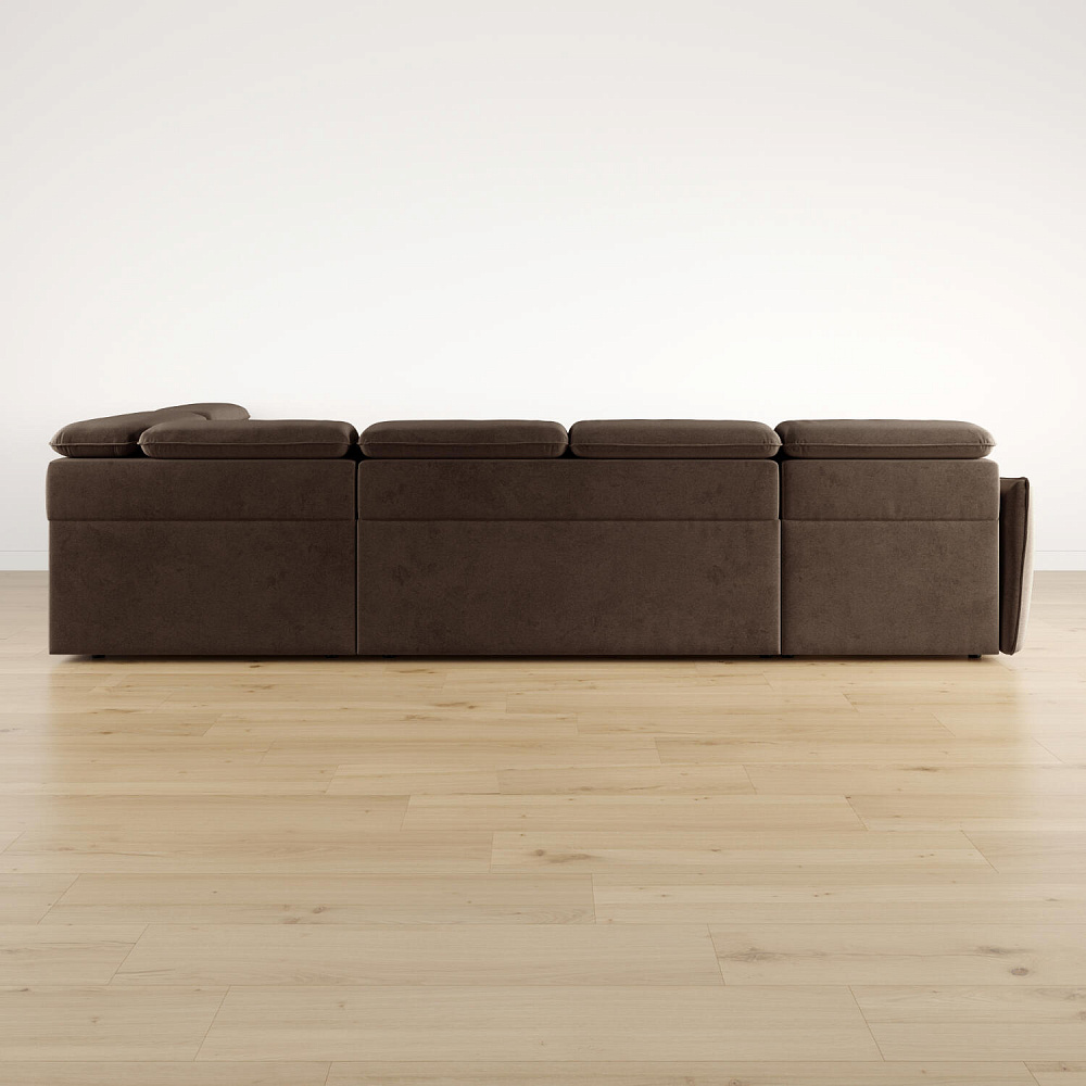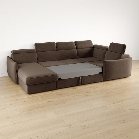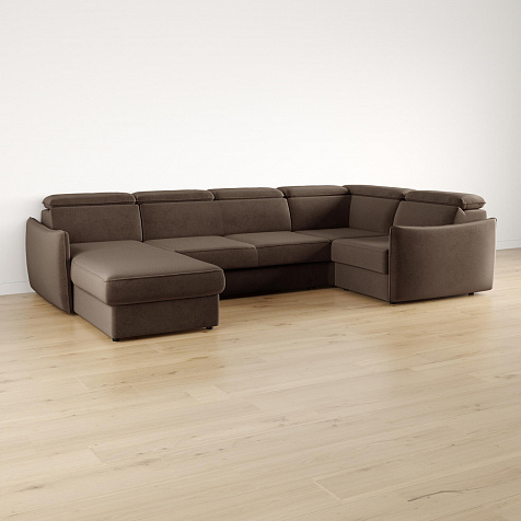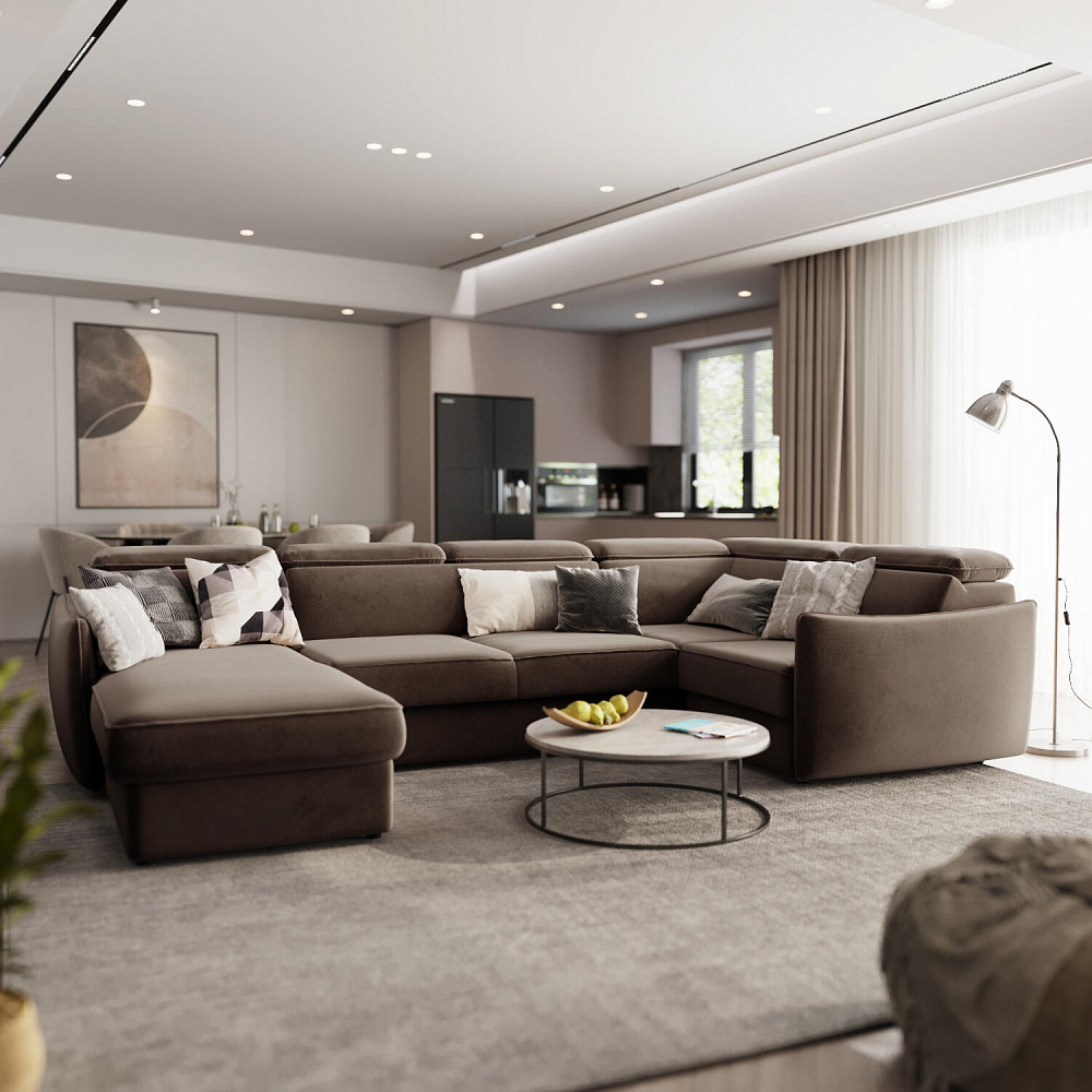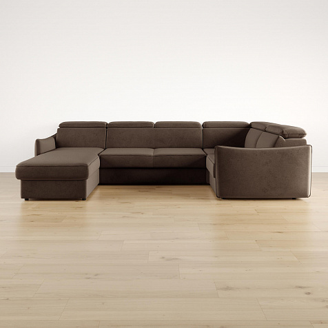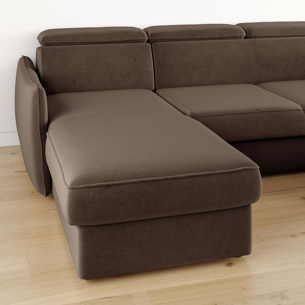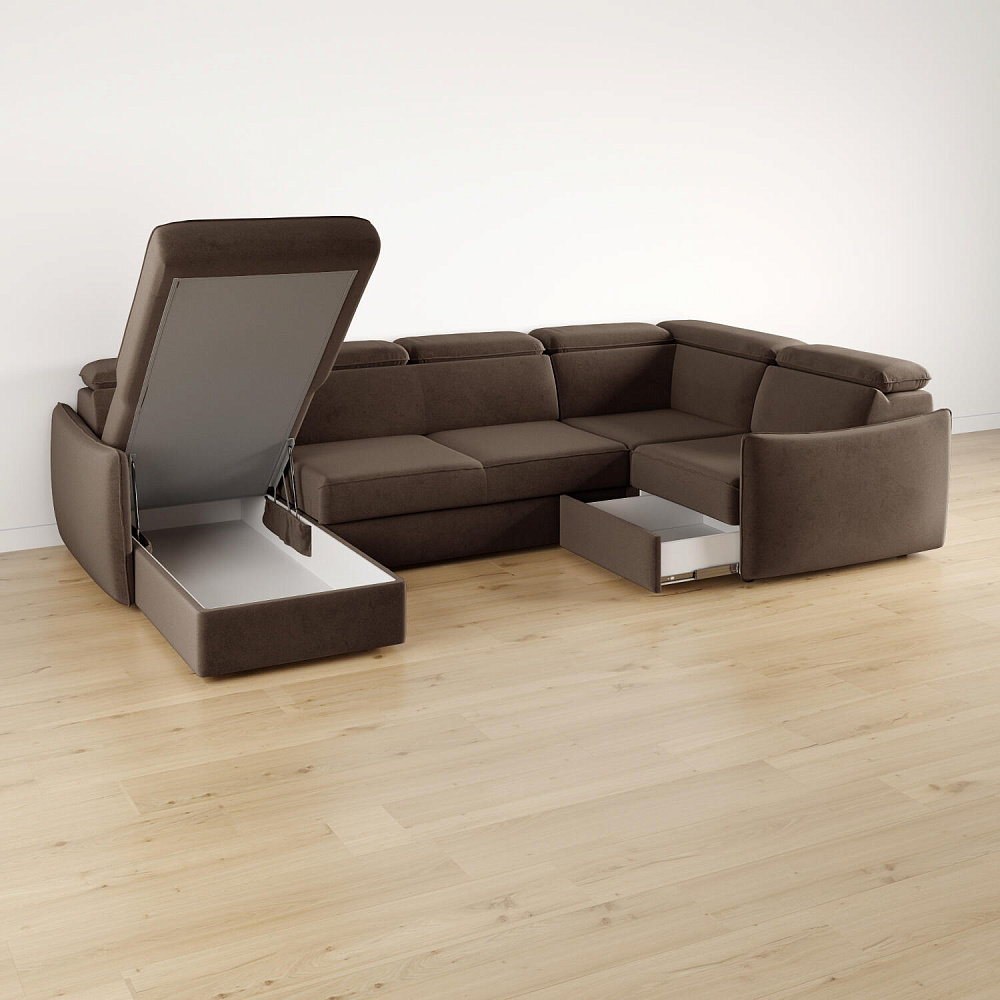 Широкий П-образный диван «Торонто» — идеальное решение для просторной гостиной и большой семьи. Благодаря своим габаритам модель подойдет для семейного просмотра фильмов и встречи гостей. Механизм трансформации «Дельфин» обеспечивает ровное спальное место, что идеально подходит для ежедневного сна. Регулируемые подголовники имеют шесть положений, поэтому можно подобрать подходящее положение и с комфортном расслабиться после рабочего дня. В кресельной части установлен ящик для хранения постельного белья и других вещей. Аккуратная отсрочка на подлокотниках и подголовниках завершают строгий образ модели.