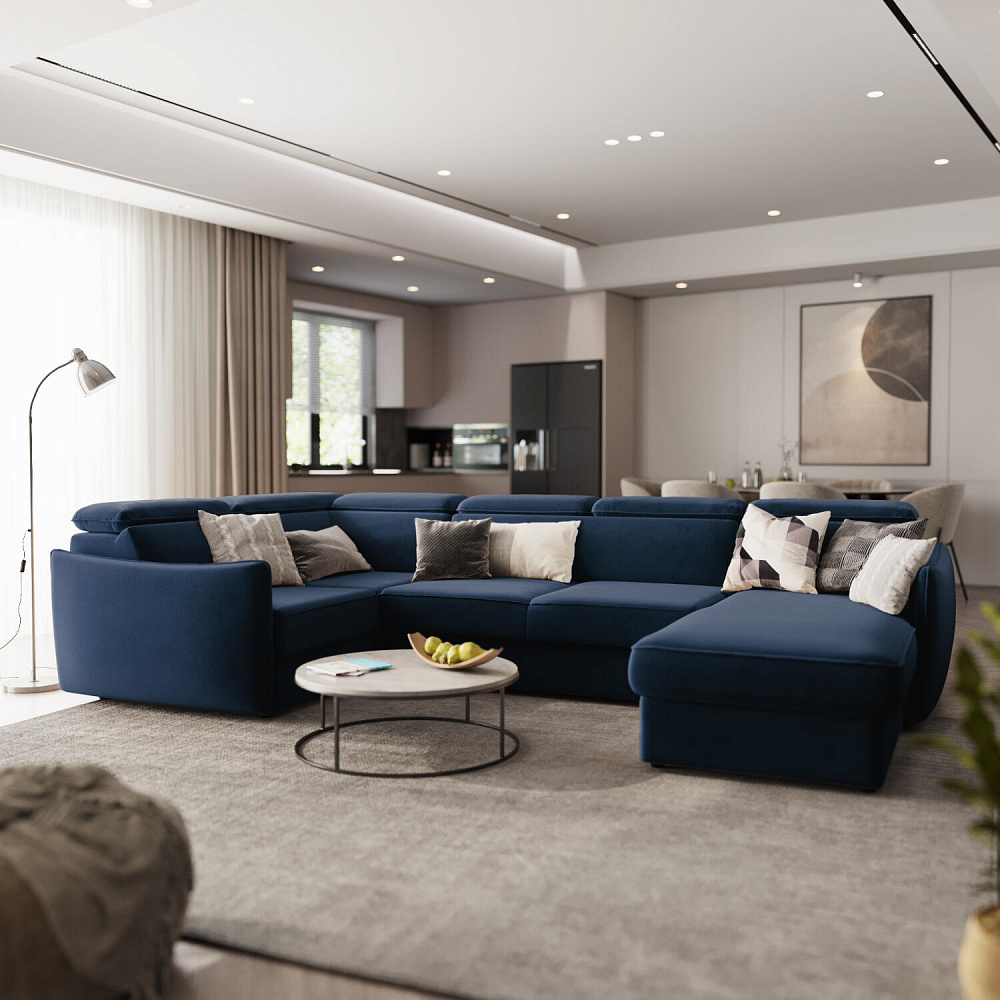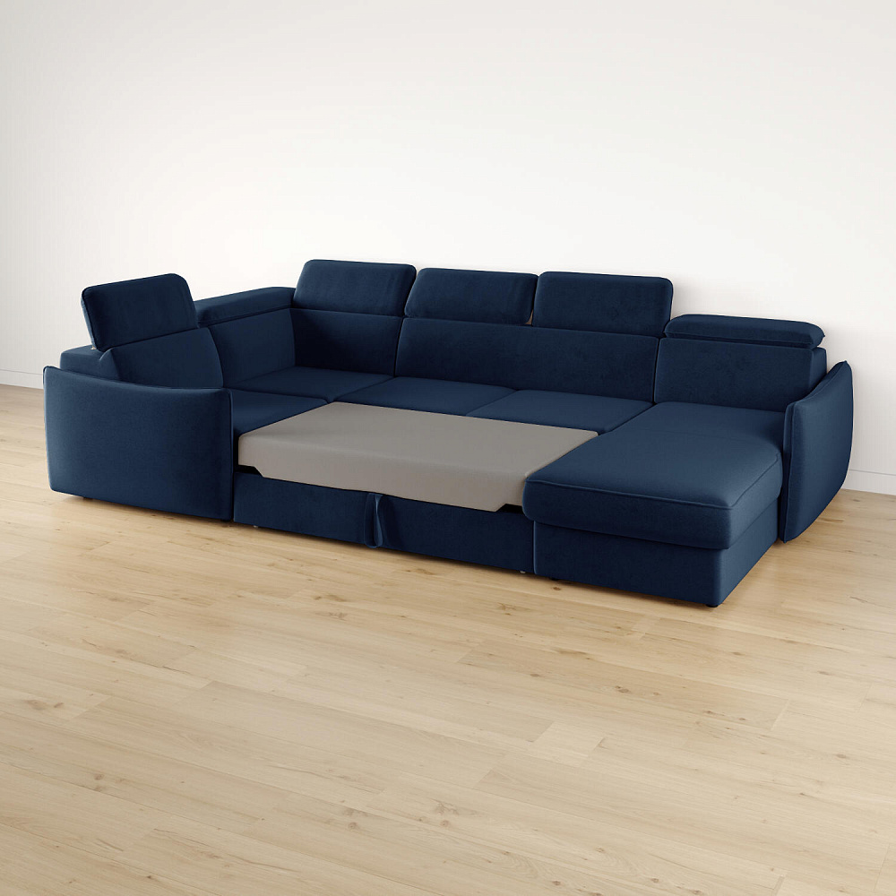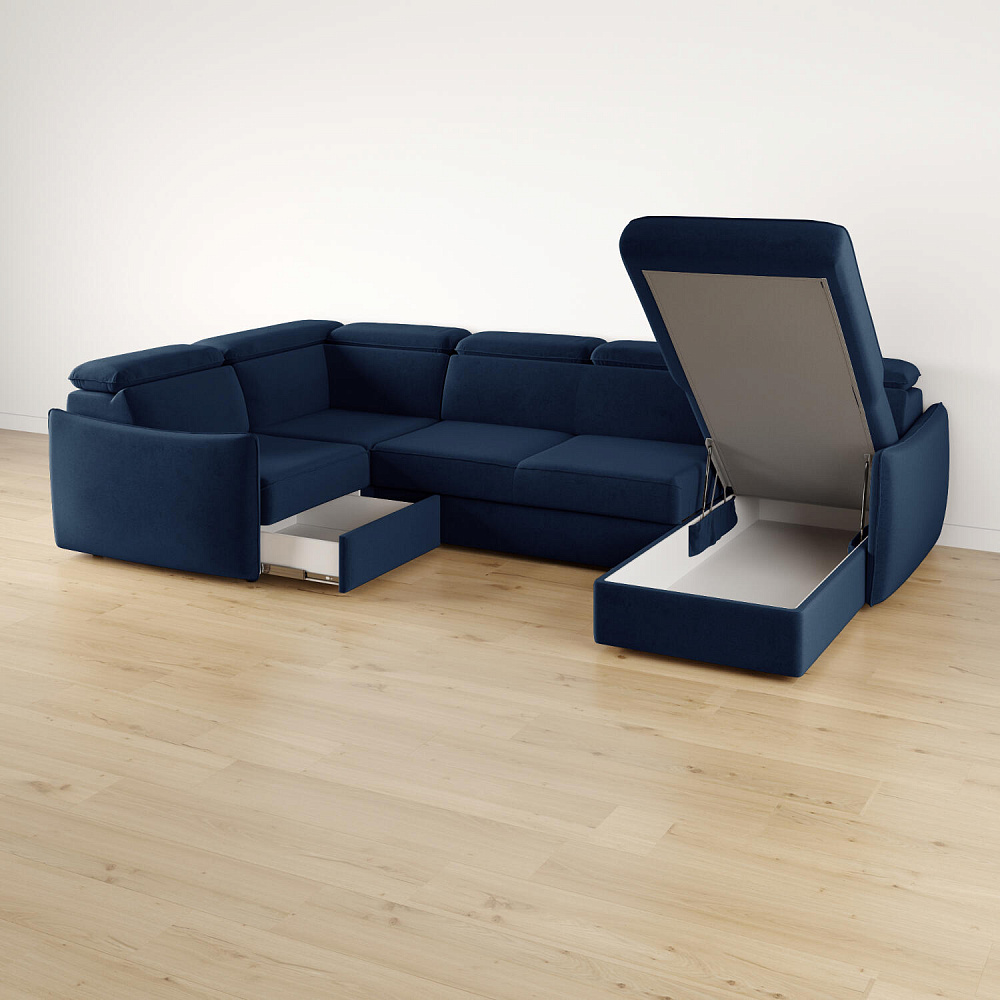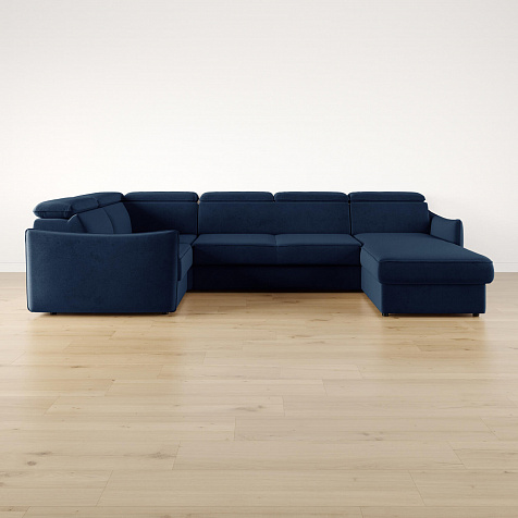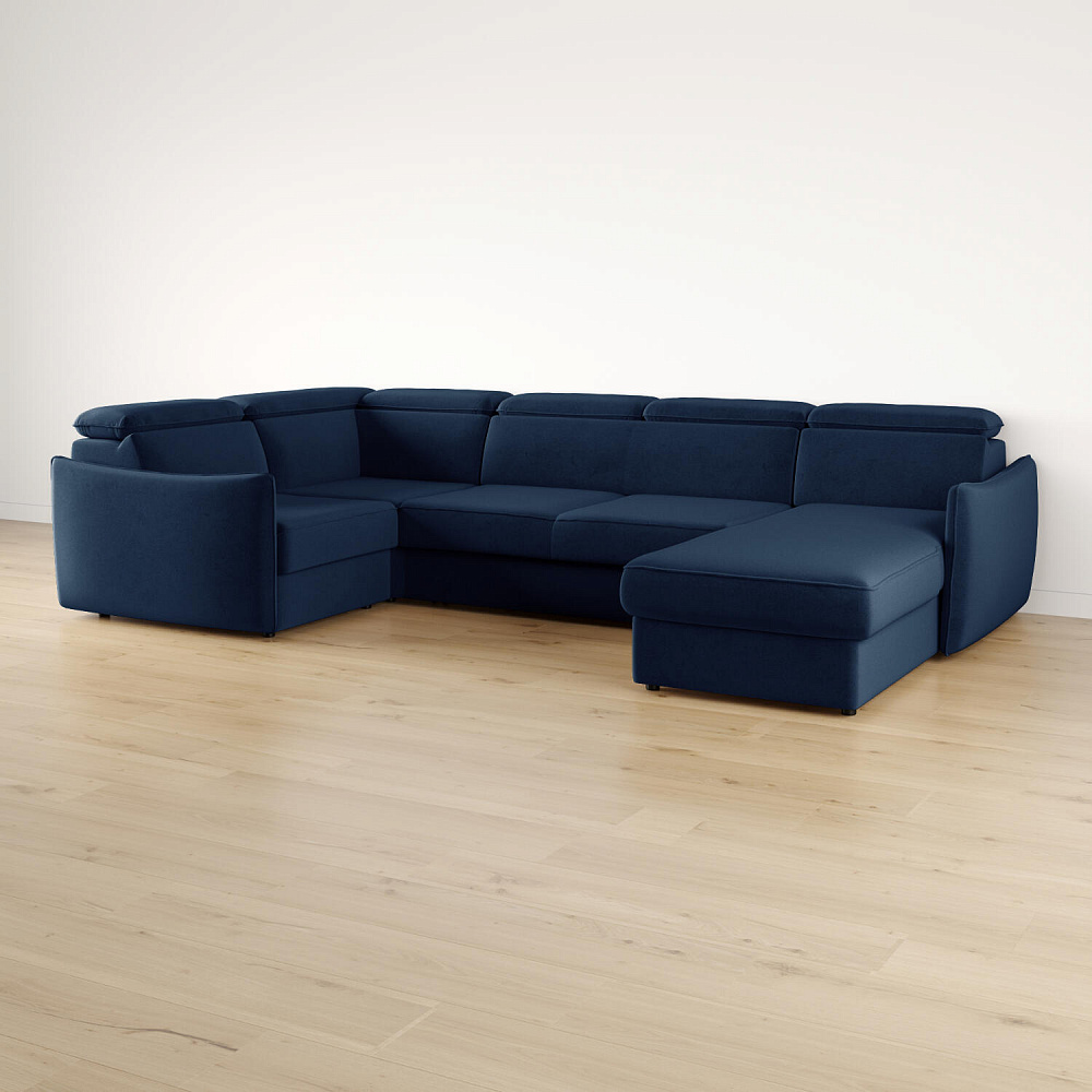 Широкий П-образный диван «Торонто» — идеальное решение для просторной гостиной и большой семьи. Благодаря своим габаритам модель подойдет для семейного просмотра фильмов и встречи гостей. Механизм трансформации «Дельфин» обеспечивает ровное спальное место, что идеально подходит для ежедневного сна. Регулируемые подголовники имеют шесть положений, поэтому можно подобрать подходящее положение и с комфортном расслабиться после рабочего дня. В кресельной части установлен ящик для хранения постельного белья и других вещей. Аккуратная отсрочка на подлокотниках и подголовниках завершают строгий образ модели.
