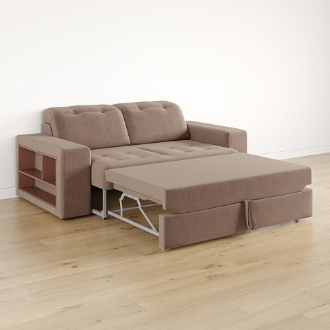 Выкатной механизм трансформации. Диван раскладывается в два движения. Сначала выкатите нижнюю планку до упора, а затем потяните внутреннее сиденье за специальную петлю вверх и на себя. Cиденье поднимется и зафиксируется.