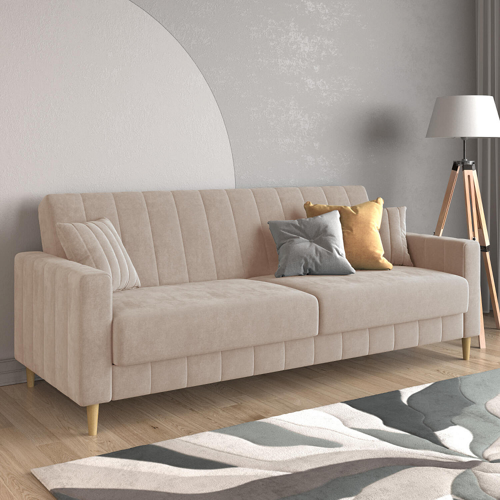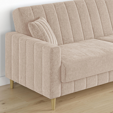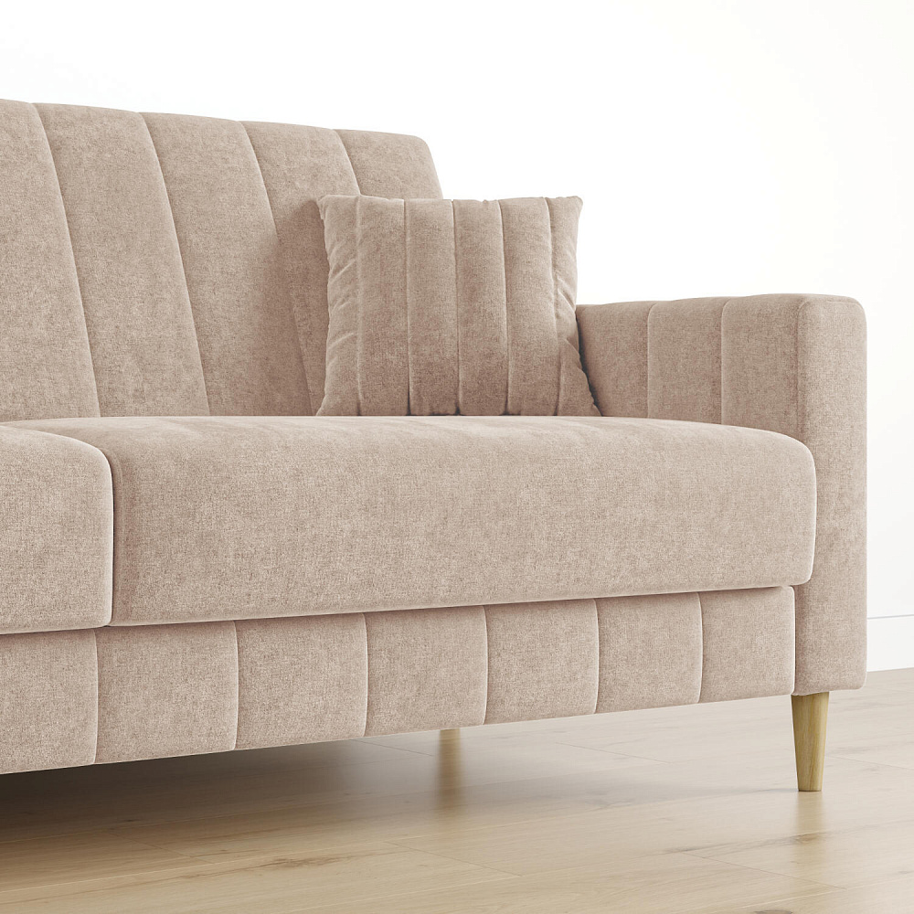 Диван «Бронкс» дополнит гостиную в современном или скандинавском стиле. Модель сочетает в себе минималистичный дизайн, спальное место и ящик для хранения. Задняя часть спинки выполнена в основной обивочной ткани, что дает возможность свободно размещать диван и зонировать комнату. Высокие опоры из натурального дерева создают легкий эффект невесомости и значительно облегчают процесс уборки.