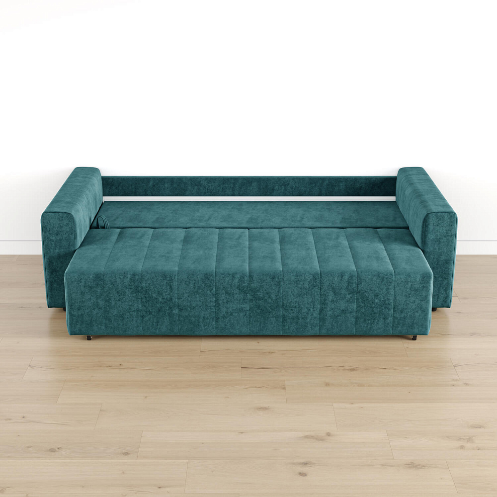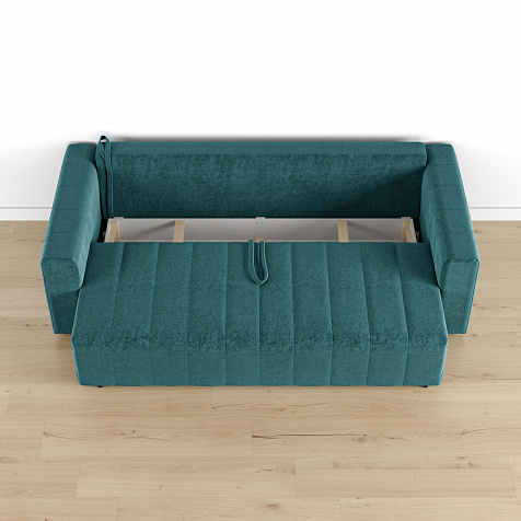 Механизм трансформации «Еврокнижка». Диван легко раскладывается — нужно выкатить вперед сиденье и опустить спинку. Удобен механизм ещё тем, что двигается только передняя часть, поэтому отодвигать диван от стены не требуется.