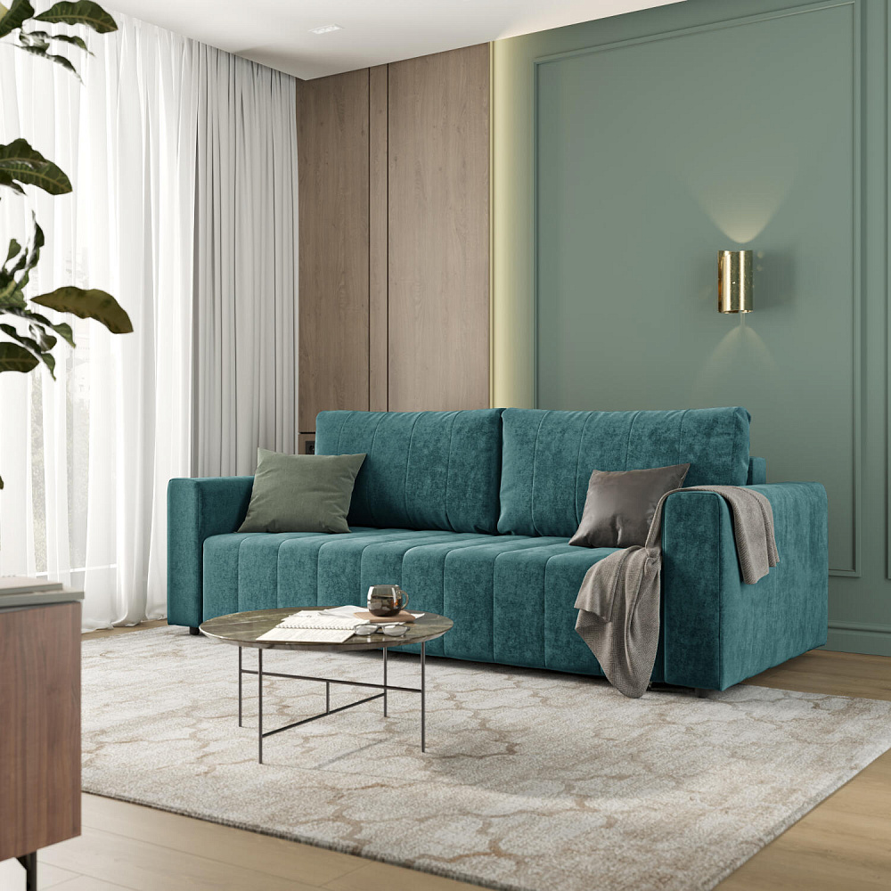 Прямой диван «Хаген» — идеальное сочетание простоты, спокойствия и комфорта. Пропорциональные и симметричные формы модели украшены легкой строчкой на сиденье и спинке, что подчеркивает лаконичный образ, который идеально пойдет для любого современного интерьера. Диван с компактными размерами не займёт много места в помещении, а встроенный бельевой короб сэкономит место в шкафу. В два легких движения «Хаген» трансформируется в кровать с полутораспальным местом, подходящую для ежедневного сна.