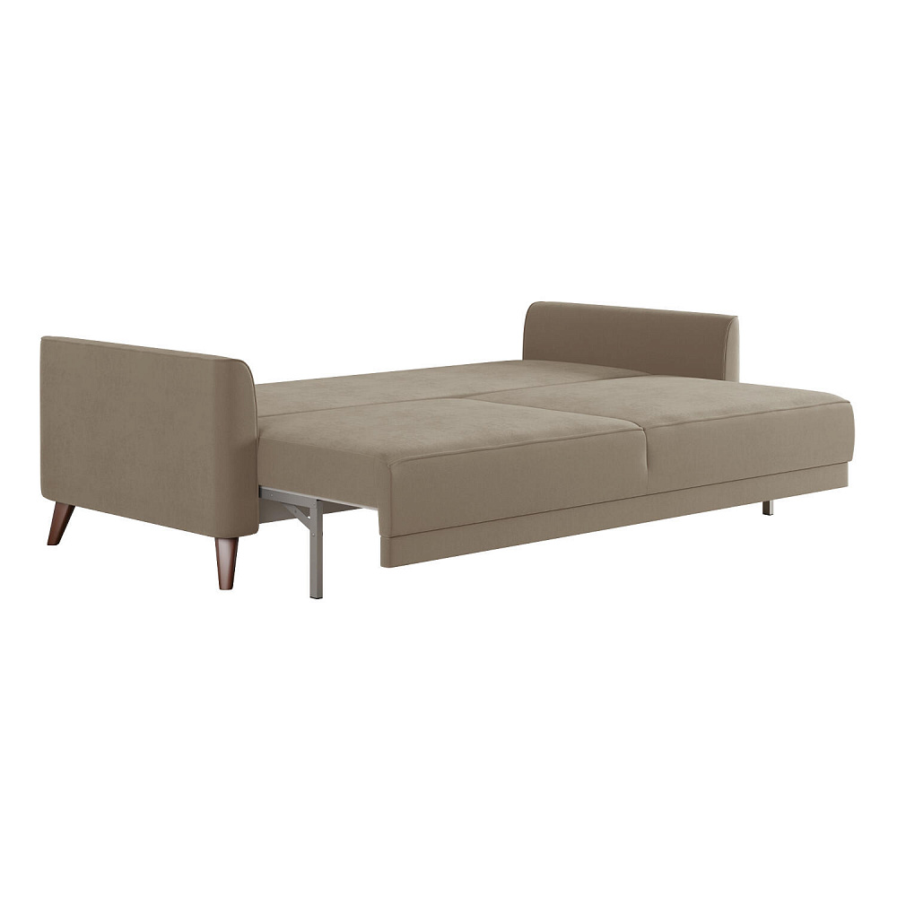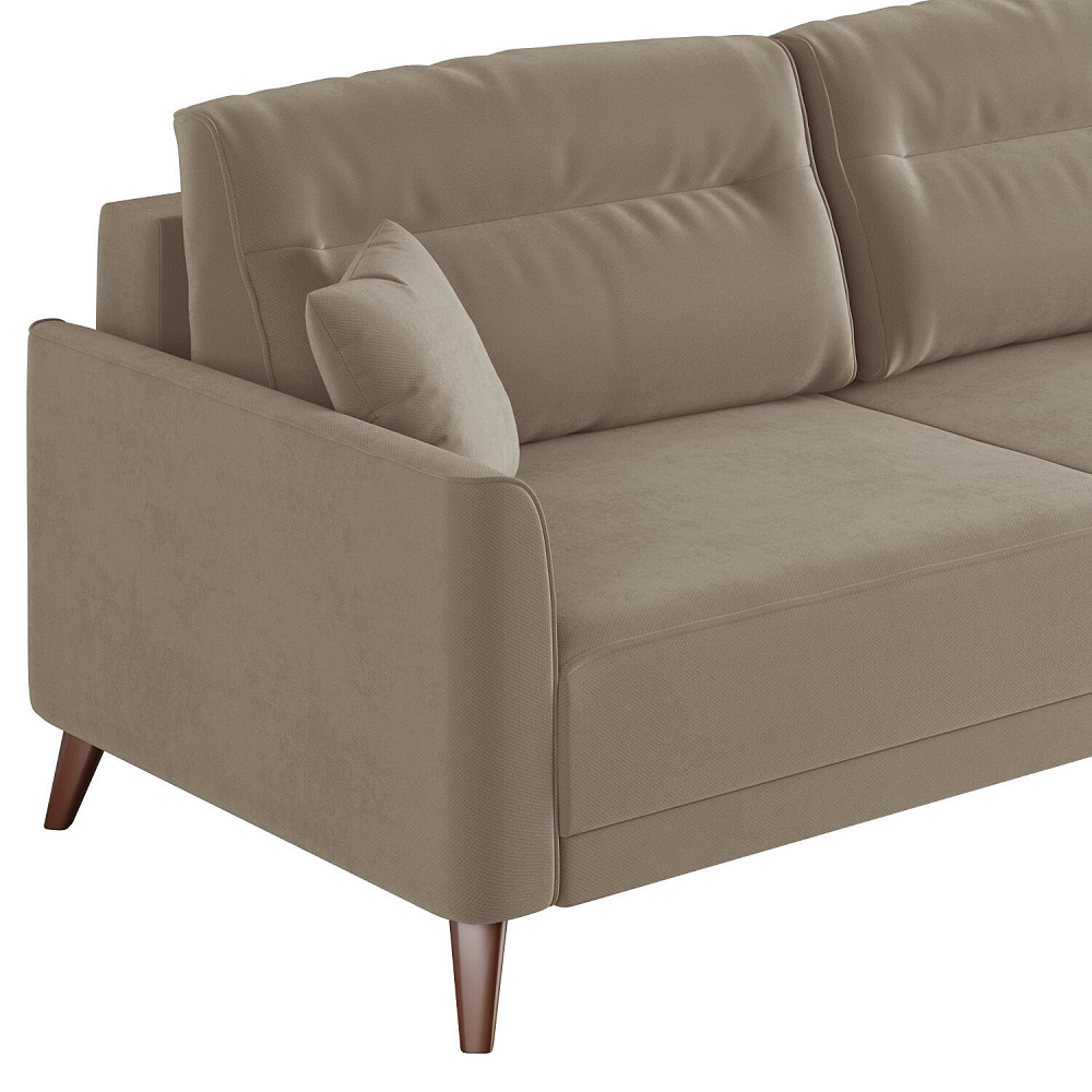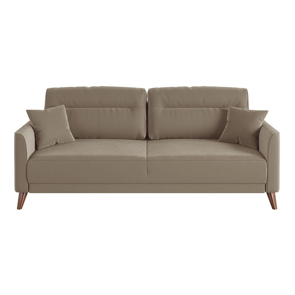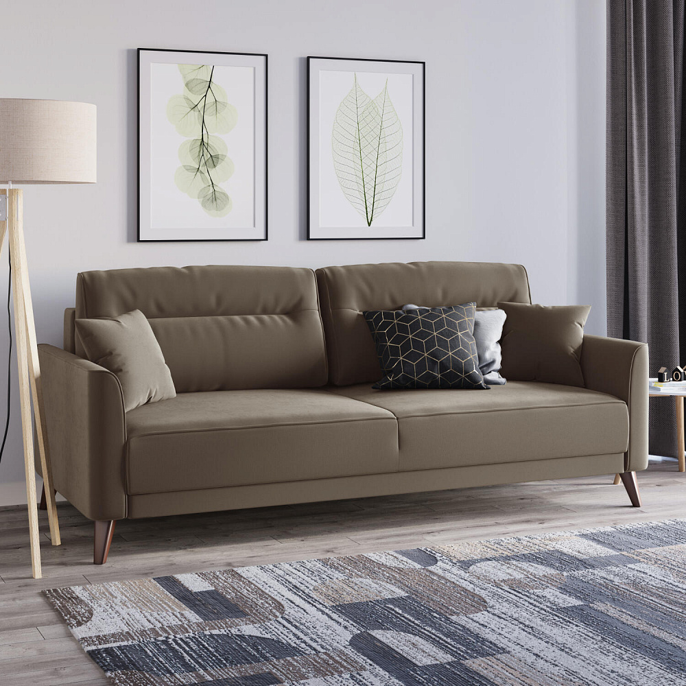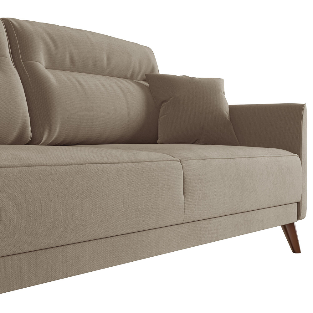 Диван «Монз» с глубокой посадкой оснащён механизмом трансформации и большим бельевым коробом. Дизайн отличается оригинальной строчкой на сиденье и приспинных подушках, декоративными подушками в комплекте и узкими подлокотниками. Высокие опоры визуально облегчают конструкцию дивана и открывают доступ к уборке пространства под ним.