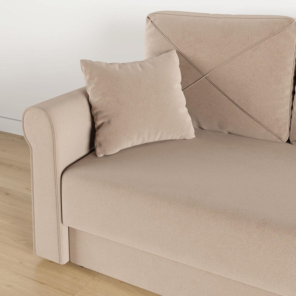 - Механизм трансформации «Еврокнижка». Диван легко раскладывается — достаточно выкатить вперёд сиденье и опустить спинку. Отодвигать диван от стены не требуется.