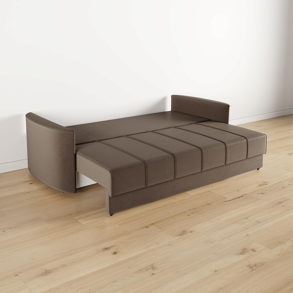 - Механизм трансформации «Еврокнижка». Диван легко раскладывается — достаточно выкатить вперёд сиденье и опустить спинку. Отодвигать диван от стены не требуется.