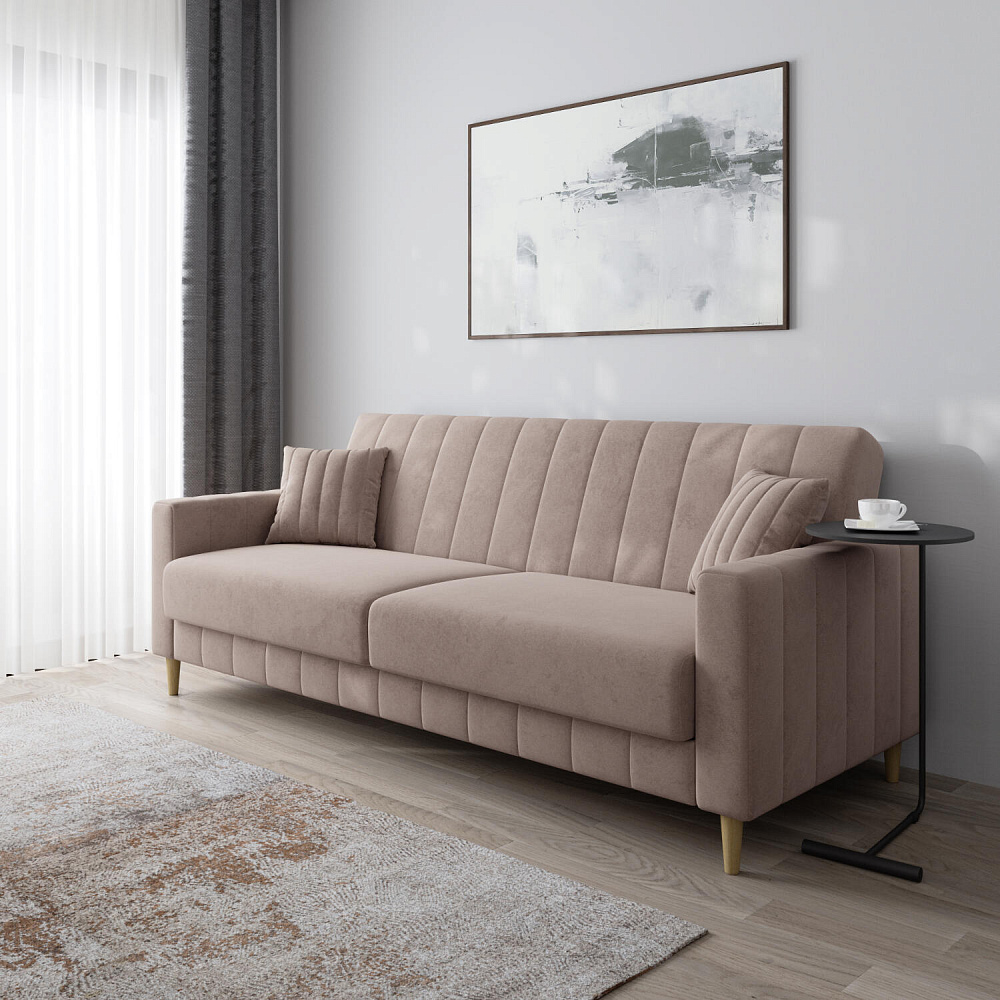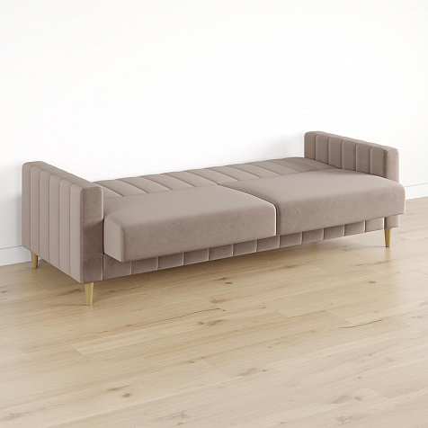 Механизм трансформации «Книжка». Чтобы разложить диван, нужно приподнять сиденье до щелчка и опустить вниз. Лучше ставить диван на расстоянии от стены, чтобы не двигать его при трансформации.