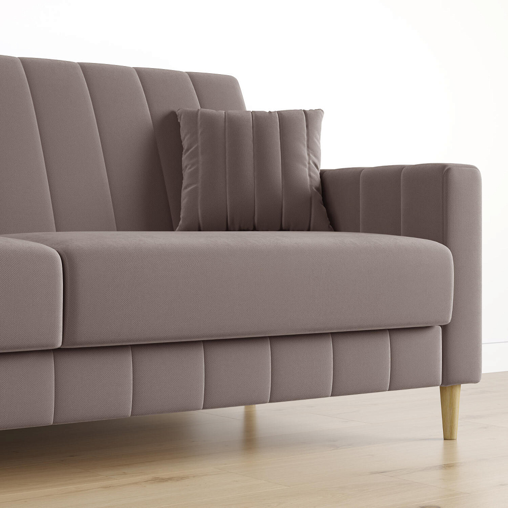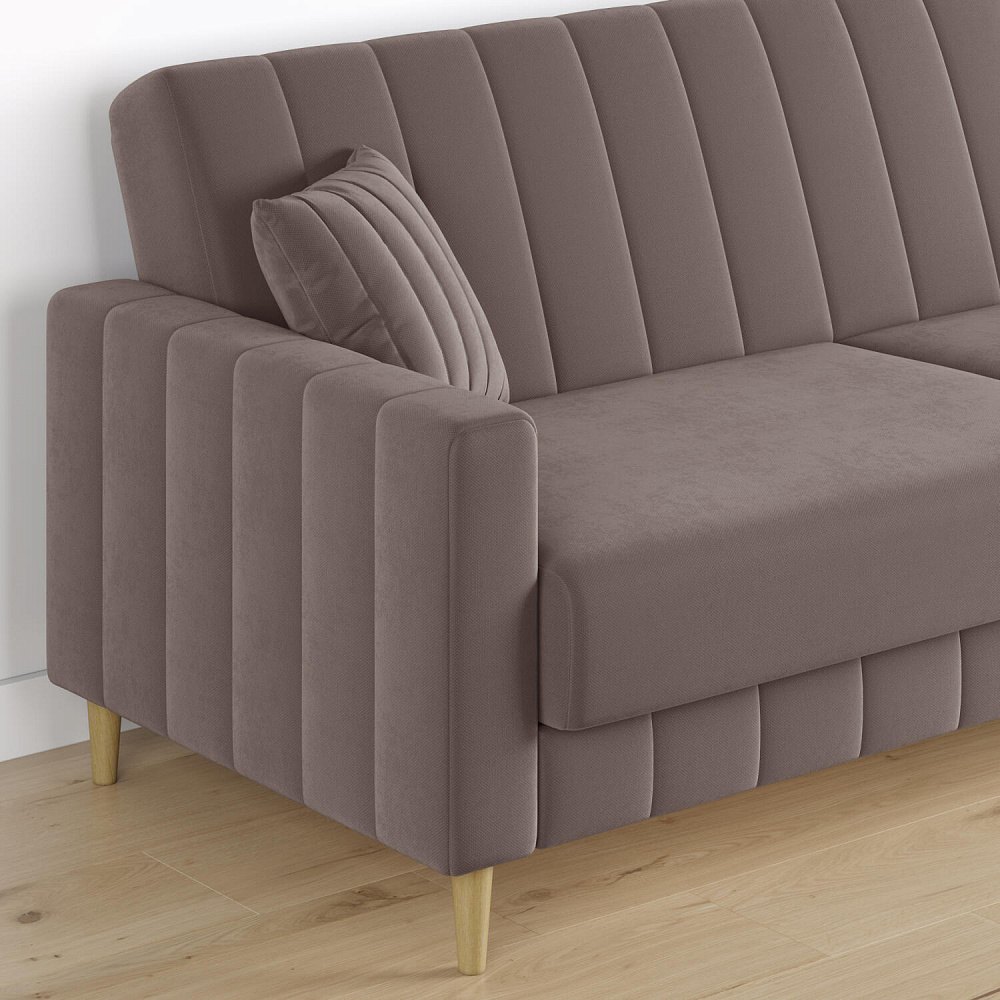 Диван «Бронкс» дополнит гостиную в современном или скандинавском стиле. Модель сочетает в себе минималистичный дизайн, спальное место и ящик для хранения. Задняя часть спинки выполнена в основной обивочной ткани, что дает возможность свободно размещать диван и зонировать комнату. Высокие опоры из натурального дерева создают легкий эффект невесомости и значительно облегчают процесс уборки.
