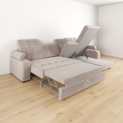 Ящики для белья в подлокотниках и под оттоманкой. В конструкции дивана предусмотрены вместительные отделения для хранения постельных принадлежностей, текстиля и других вещей.