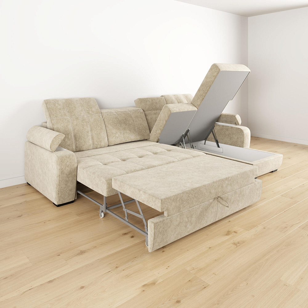 Ящики для белья в подлокотниках и под оттоманкой. В конструкции дивана предусмотрены вместительные отделения для хранения постельных принадлежностей, текстиля и других вещей.