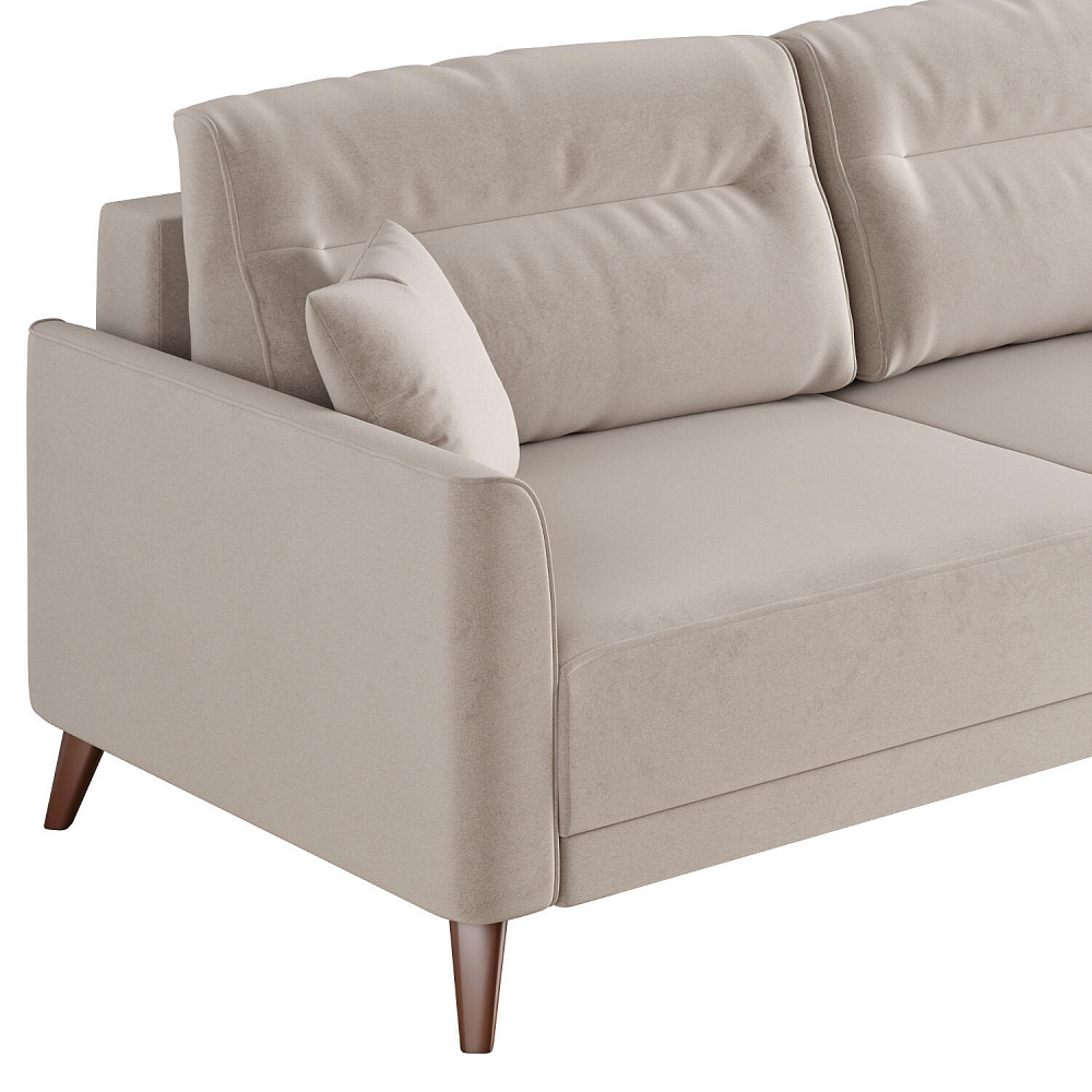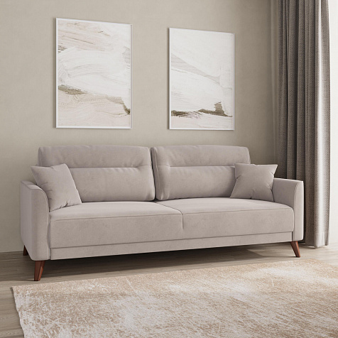 Диван «Монз» с глубокой посадкой оснащён механизмом трансформации и большим бельевым коробом. Дизайн отличается оригинальной строчкой на сиденье и приспинных подушках, декоративными подушками в комплекте и узкими подлокотниками. Высокие опоры визуально облегчают конструкцию дивана и открывают доступ к уборке пространства под ним.