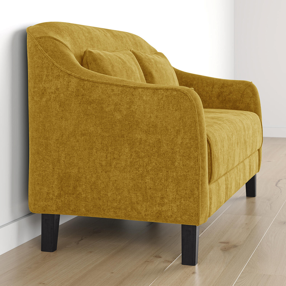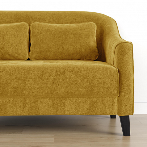 - Деревянные опоры. Высокие ножки из массива березы визуально облегчают конструкцию и открывают доступ к уборке пространства под диваном.