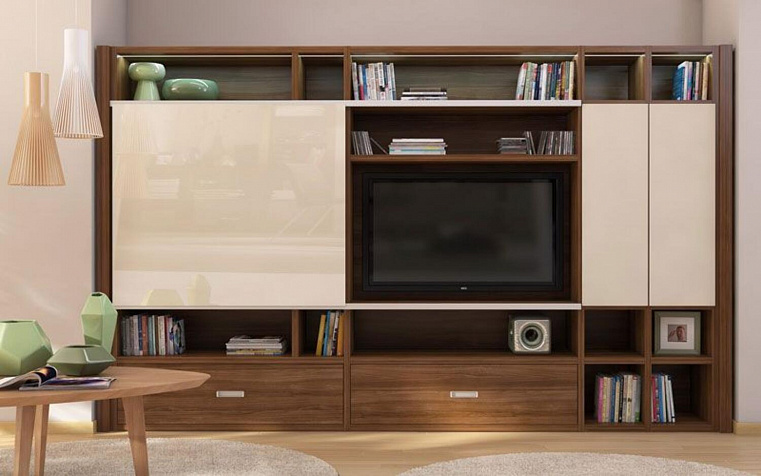 Каркас изделия выполнен из панелей МДФ в отделке пленкой «Орех Каналетто» (серия пленок «DELNATURE»). В верхних открытых нишах установлена декоративная светодиодная подсветка «NET». Выдвижные ящики оснащены механизмом полного выдвижения и плавно доводятся при закрывании. В передних стенках ящиков установлены врезные ручки «Break». Распашные и раздвижной фасад — декоративное стекло в декоре «Беж Кьяро». Большой фасад плавно и бесшумно передвигается по трекам и закрывает собой встроенный мини-бар для напитков, который оснащен всем необходимым.