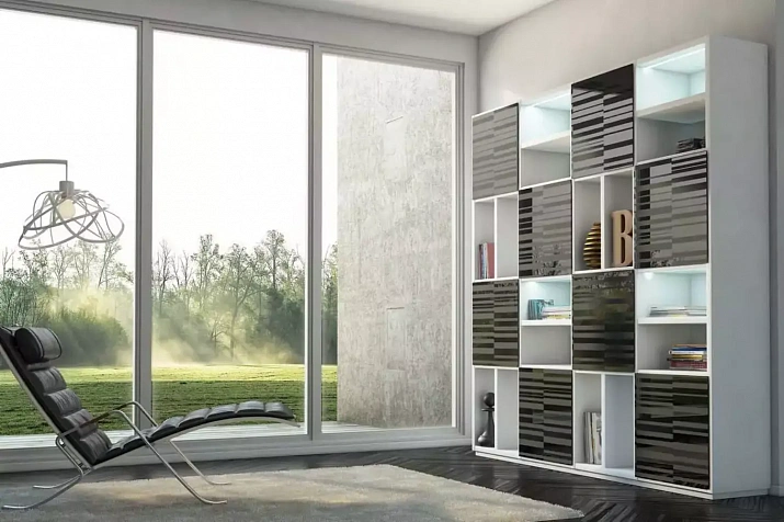 Каркас изготовлен из ламинированных панелей ДСП в декоре “Алебастр”. Фасады “Scala” декорированы темным декоративным стеклом “Баркод”. Секции, закрытые фасадами, ; чередуются с открытыми нишами, оснащенными декоративной светодиодной подсветкой.