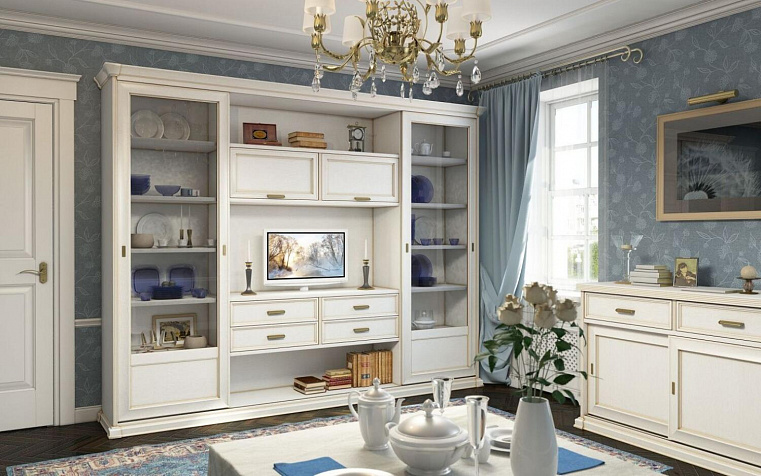 Бело-голубой интерьер гостиной навевает только самые приятные ассоциации: живописное небо, теплый летний ветерок и приподнятое настроение. Действительно, цветовые сочетания, встречающиеся нам в природе, самые удачные.Коллекция мебели в классическом стиле «Mr.Doors CLASSICS» (декор «Декапе жемчуг») будет фантастически сочетаться с нежно-голубым цветом стен и текстиля.