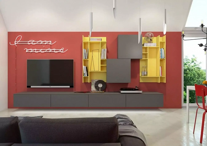 Гостиная в серо-желтых тонах, изображенная на фото, идеально подойдет молодым и энергичным людям, которые привыкли к активному отдыху. Красный цвет, выбранный для отделки одной из стен помещения, задает общее настроение всей комнате. Гостиная граничит со столовой зоной, поэтому все должно смотреться гармоничным и единым ансамблем. Помочь в этом вам смогут правильно расставленные акценты и интересные аксессуары. Например, светодиодная подсветка служит в интерьере гостиной не только для дополнительного освещения, но и являет собой центр мебельной композиции, размещенной на стене. Даже не смотря на то, что расположена в углу.
