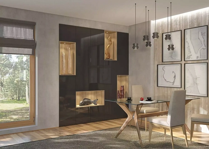 Каркас модуля изготовлен из ламинированных панелей ДСП в декоре «Дуб Орлеанский песочный». В открытых асимметрично расположенных нишах предусмотрена декоративная светодиодная подсветка (светильники «SUN»), которая выгодно подчеркивает оригинальные предметы декора и смягчает строгость и аскетичность интерьера. Фасады представляют собой панели МДФ в отделке высокоглянцевой эмалью (декор «Графит»); вместо ручек использована система «Р2О» (нажал-открыл), которая функционирует благодаря комплекту мебельных петель и инерционного фиксатора.